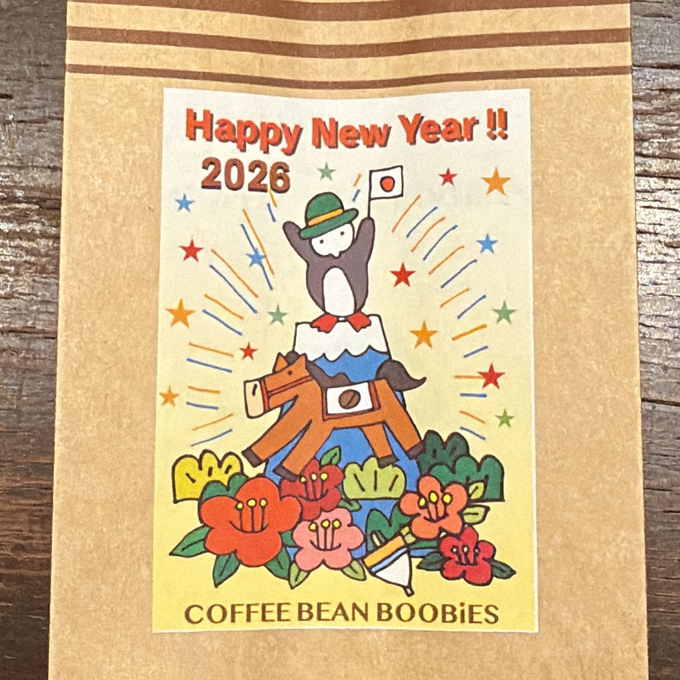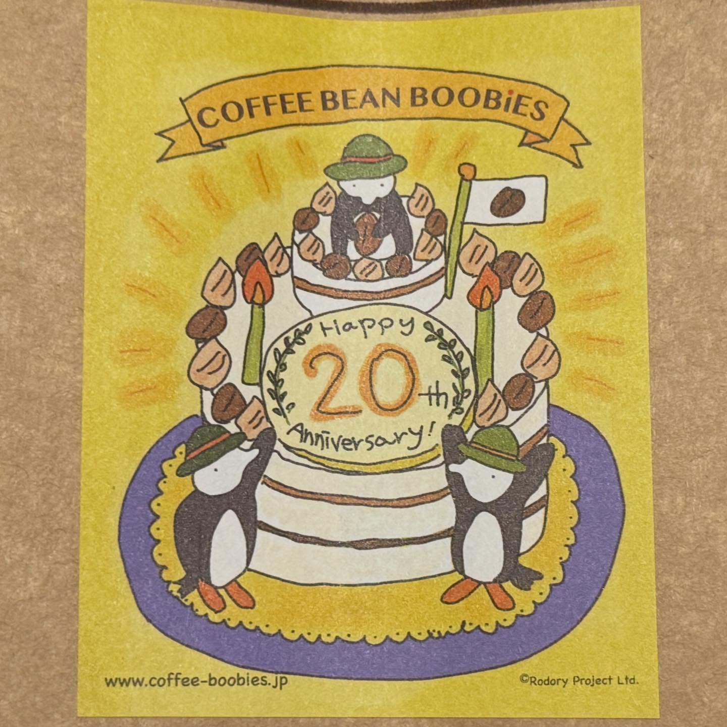 ブービーズではお買い上げいただいた珈琲豆を入れる袋にオリジナルのラベルを使用しています。通常はシンプルなラベル を使用していますが、時々期間限定で特別ラベルを作成、使用しています。