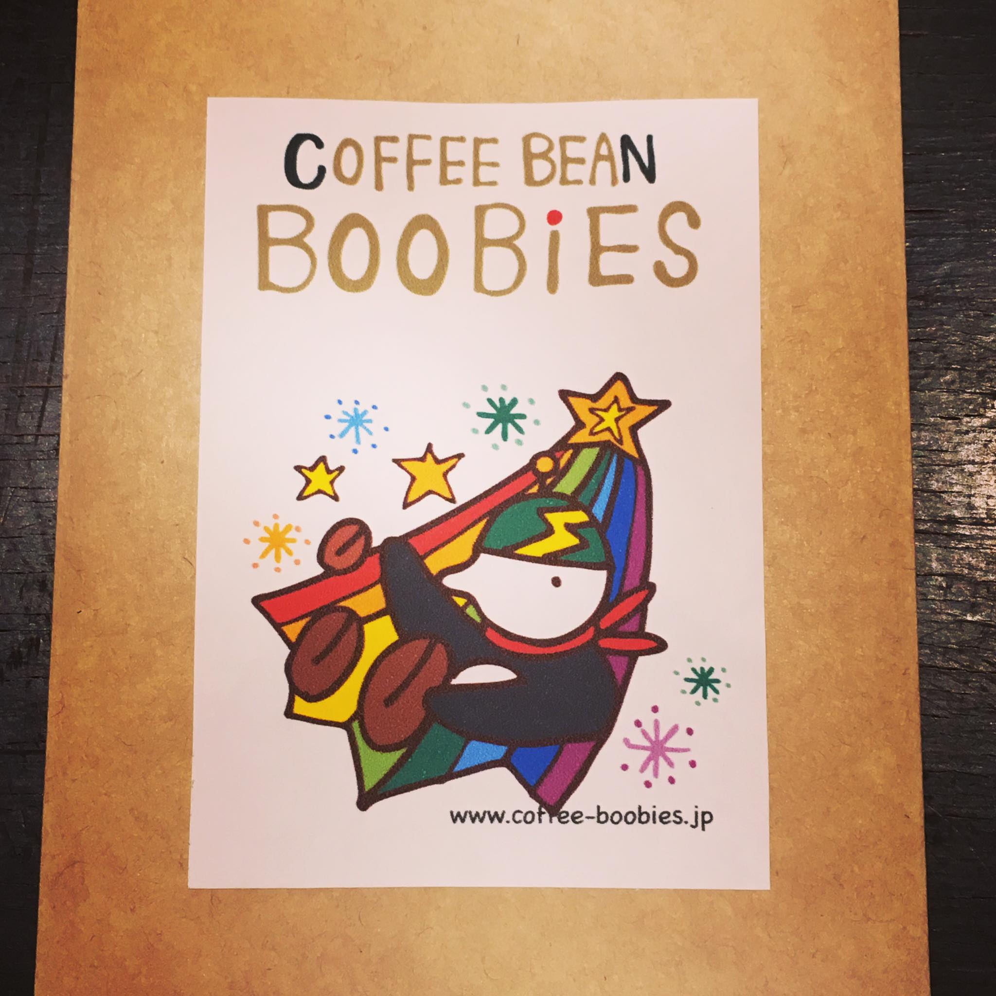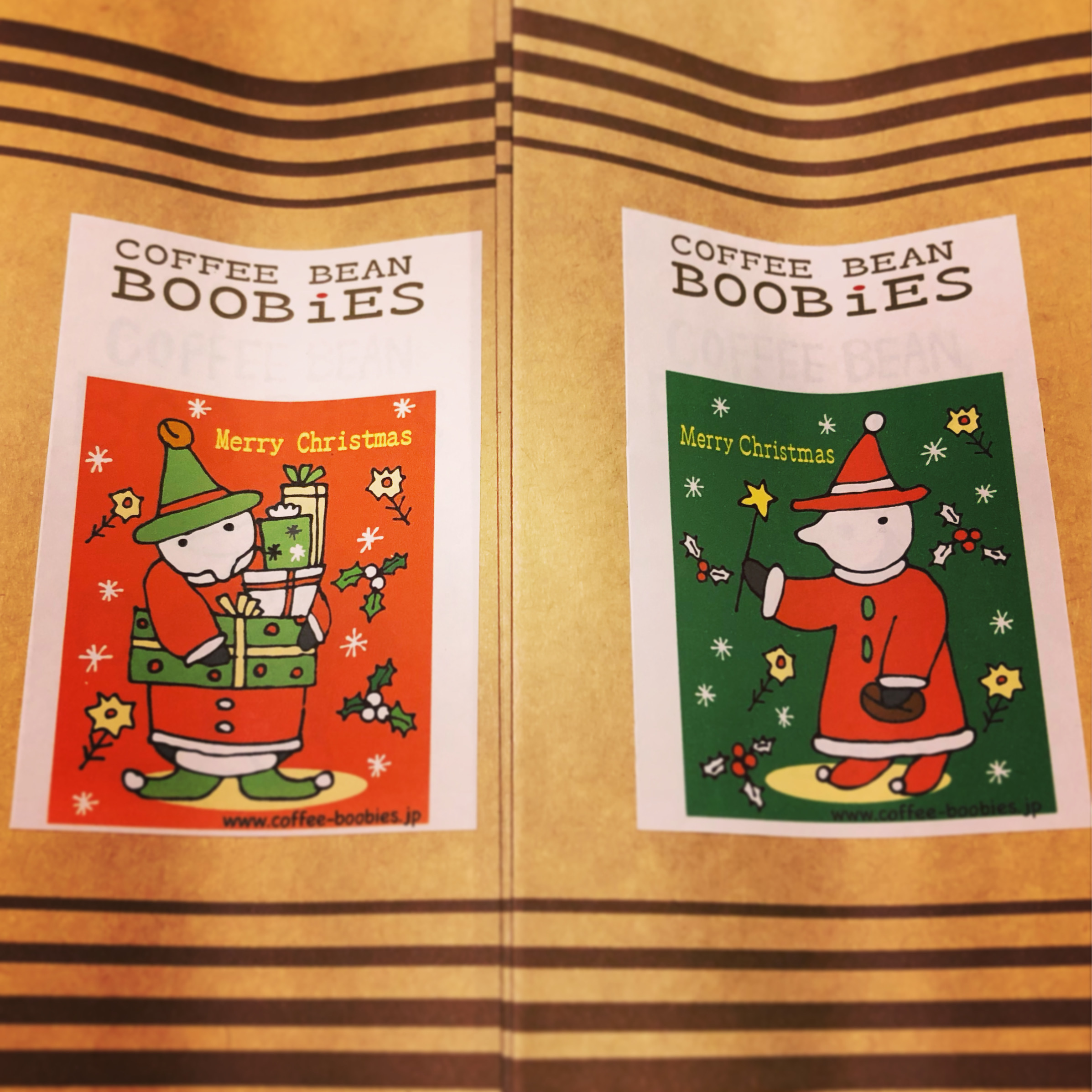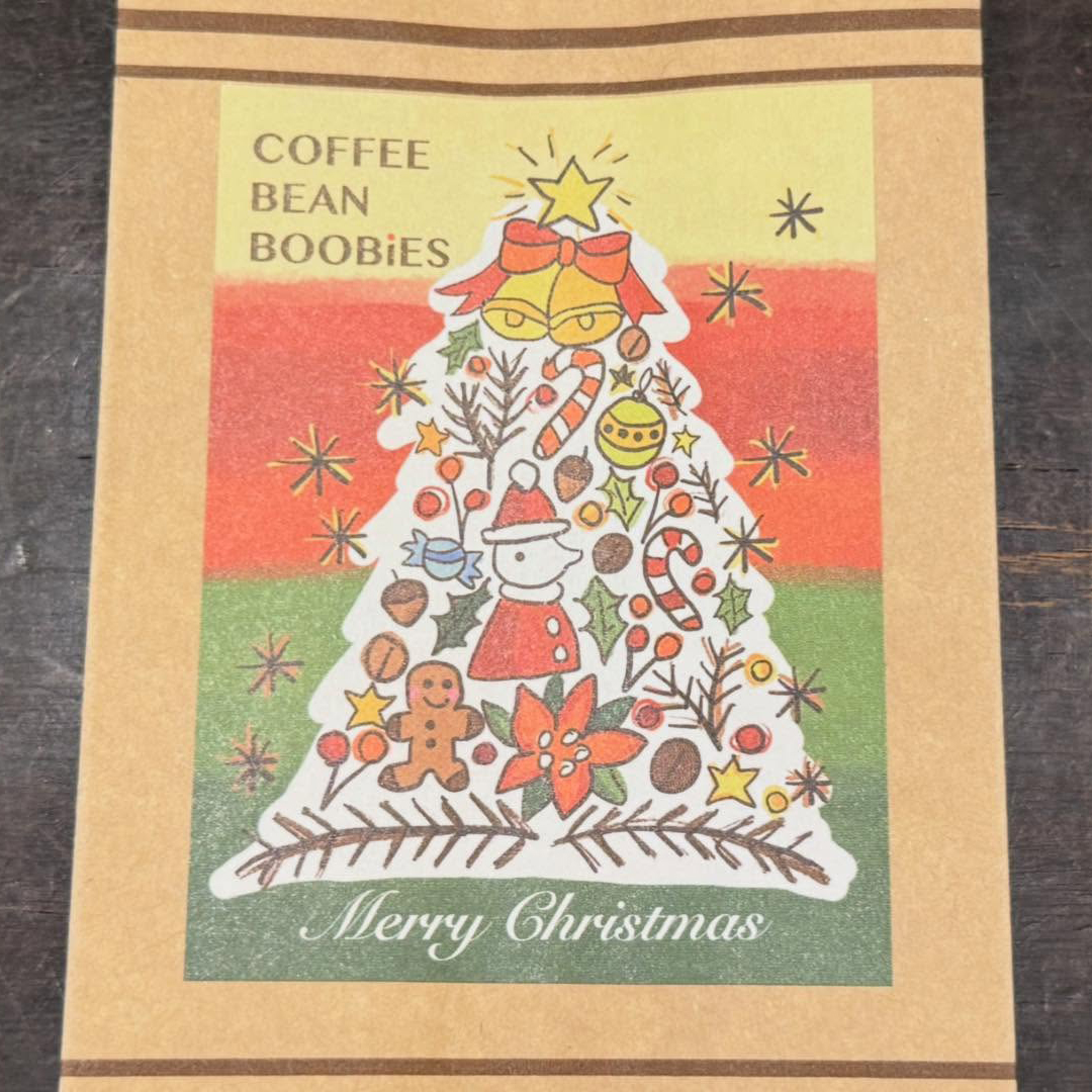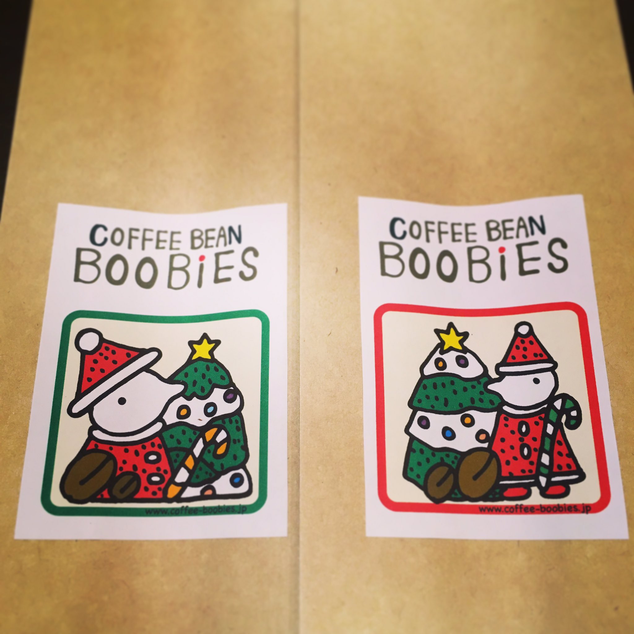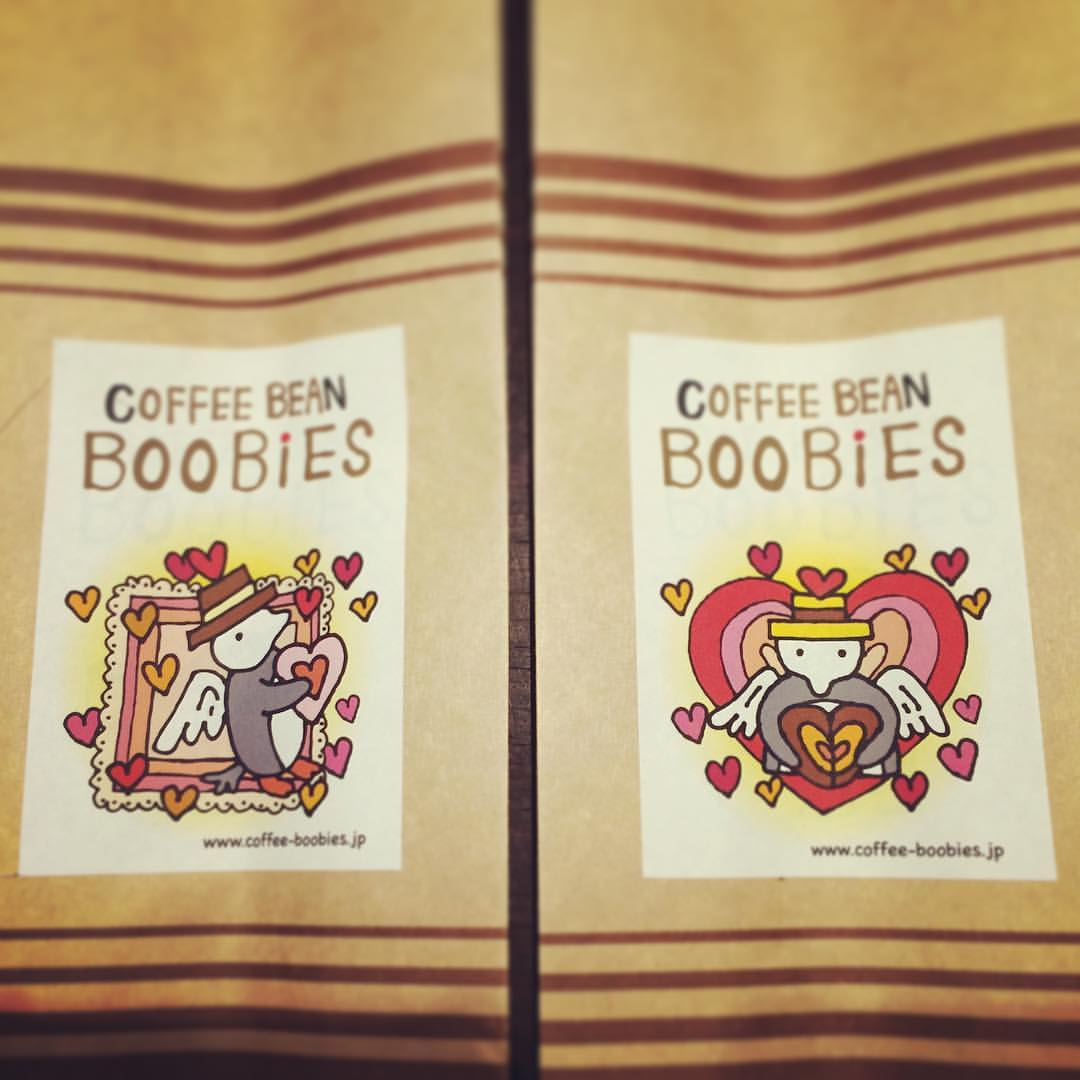 ブービーズではお買い上げいただいた珈琲豆を入れる袋にオリジナルのラベルを使用しています。通常はシンプルなラベル を使用していますが、時々期間限定で特別ラベルを作成、使用しています。