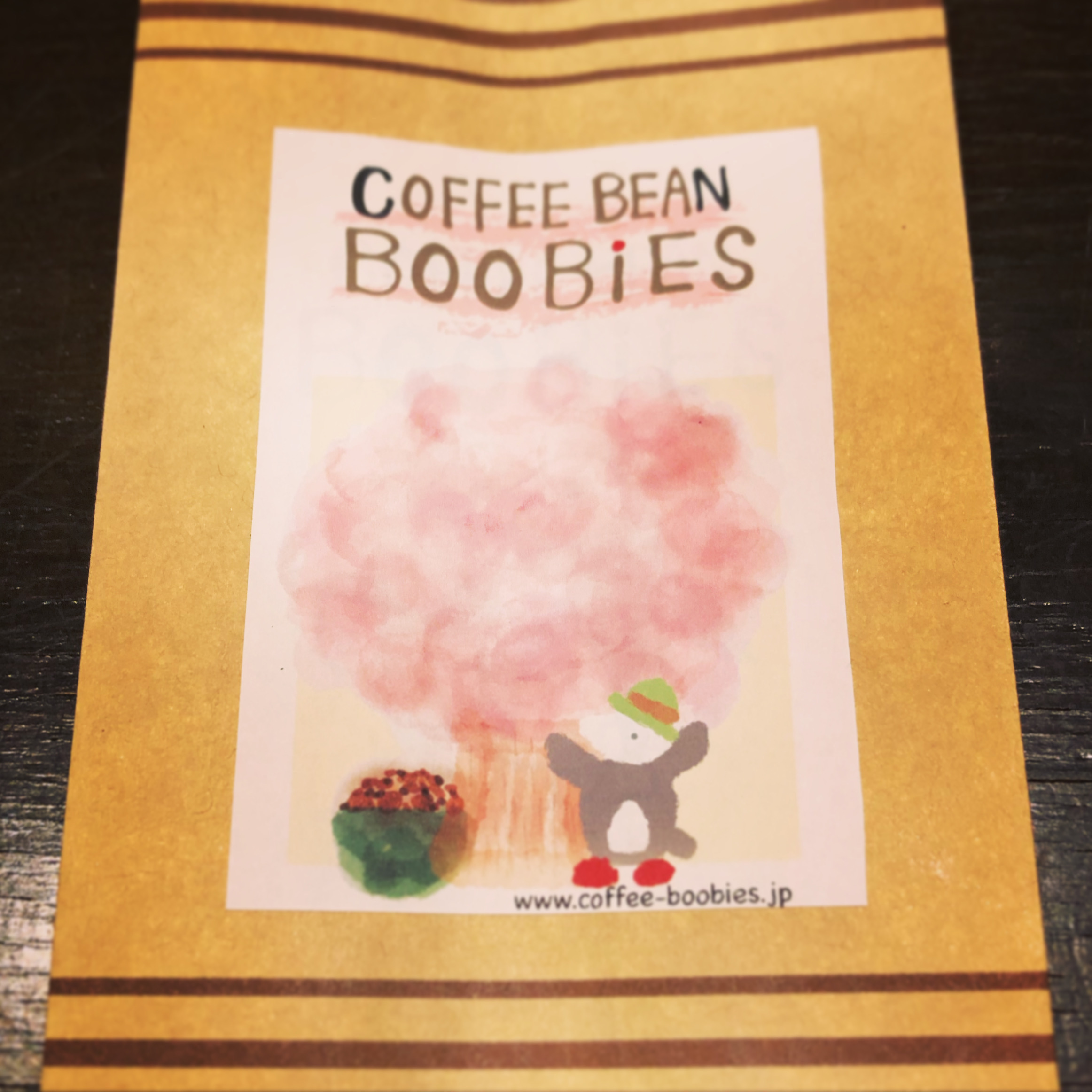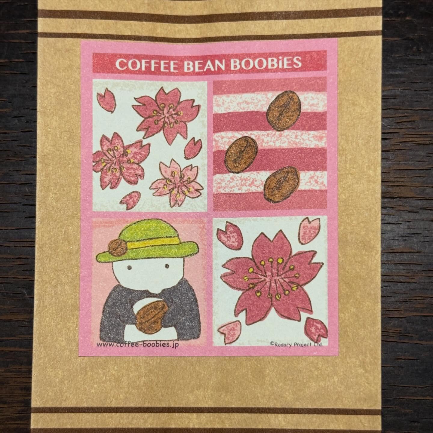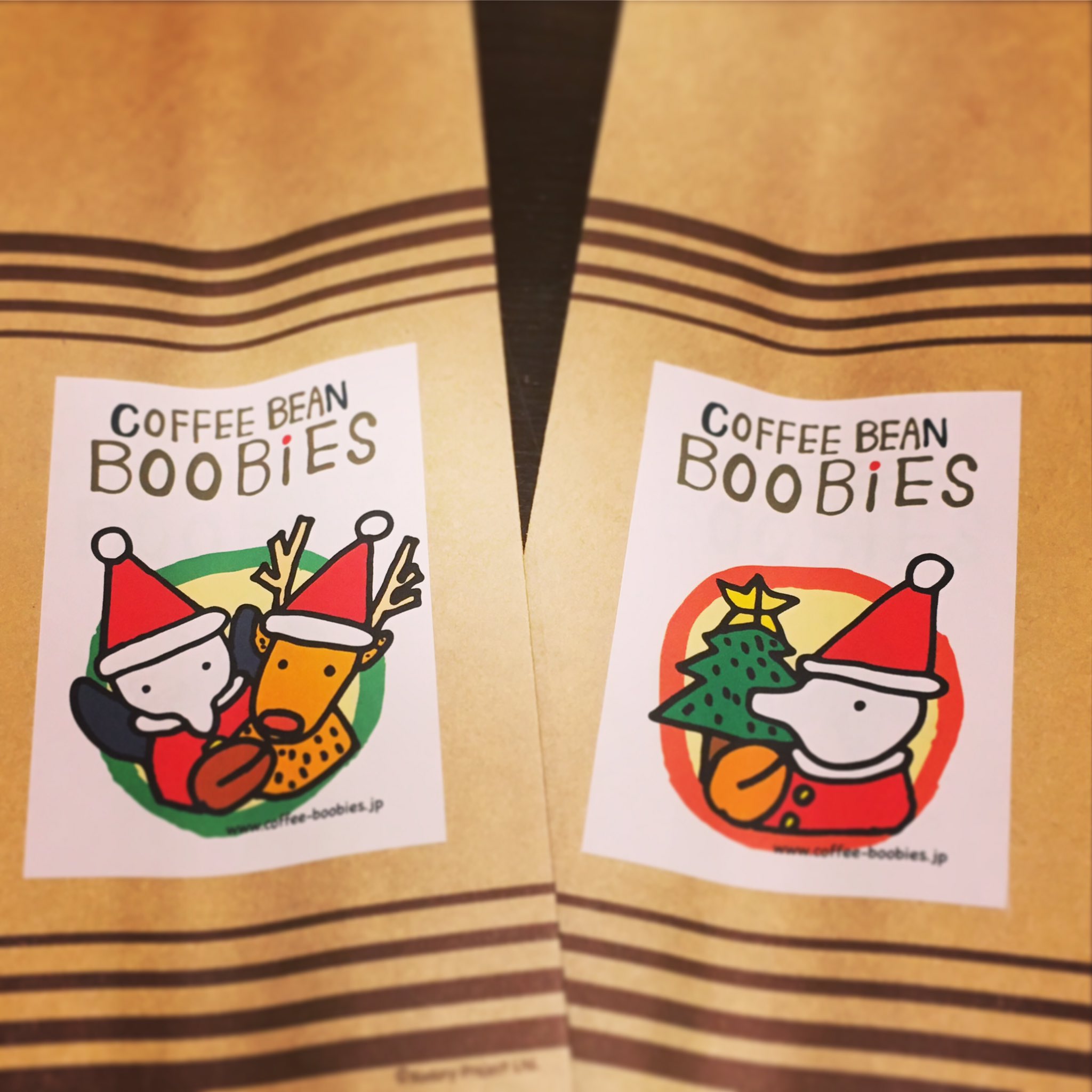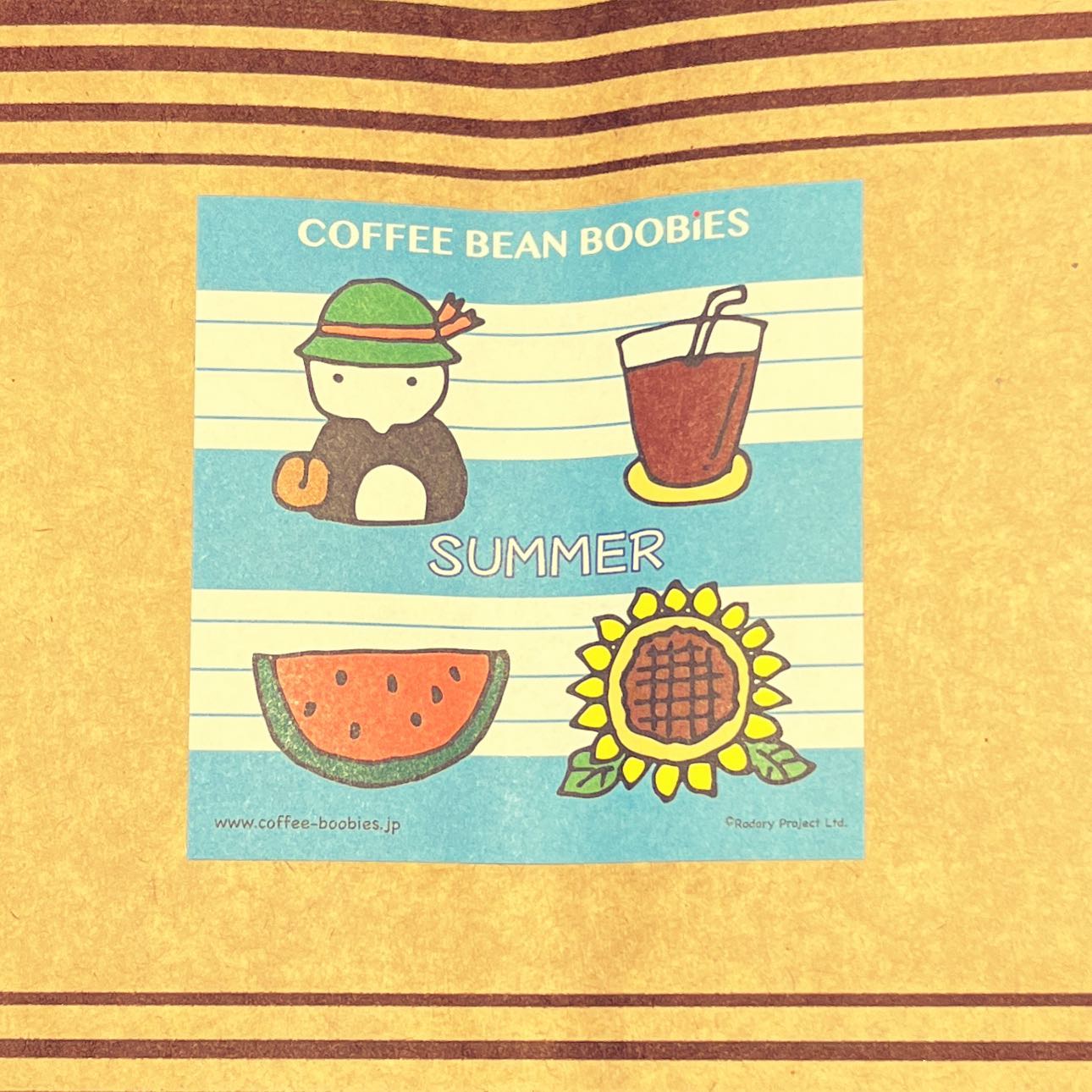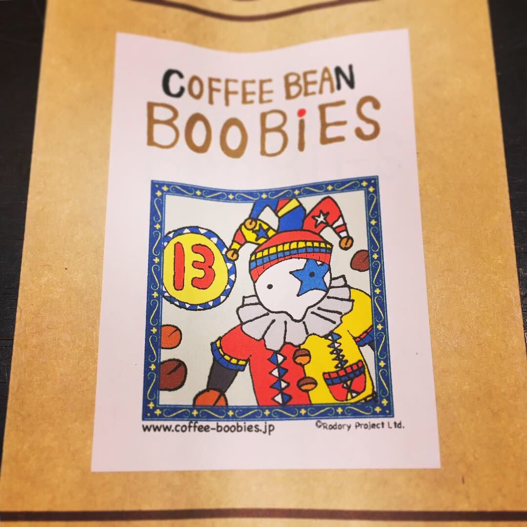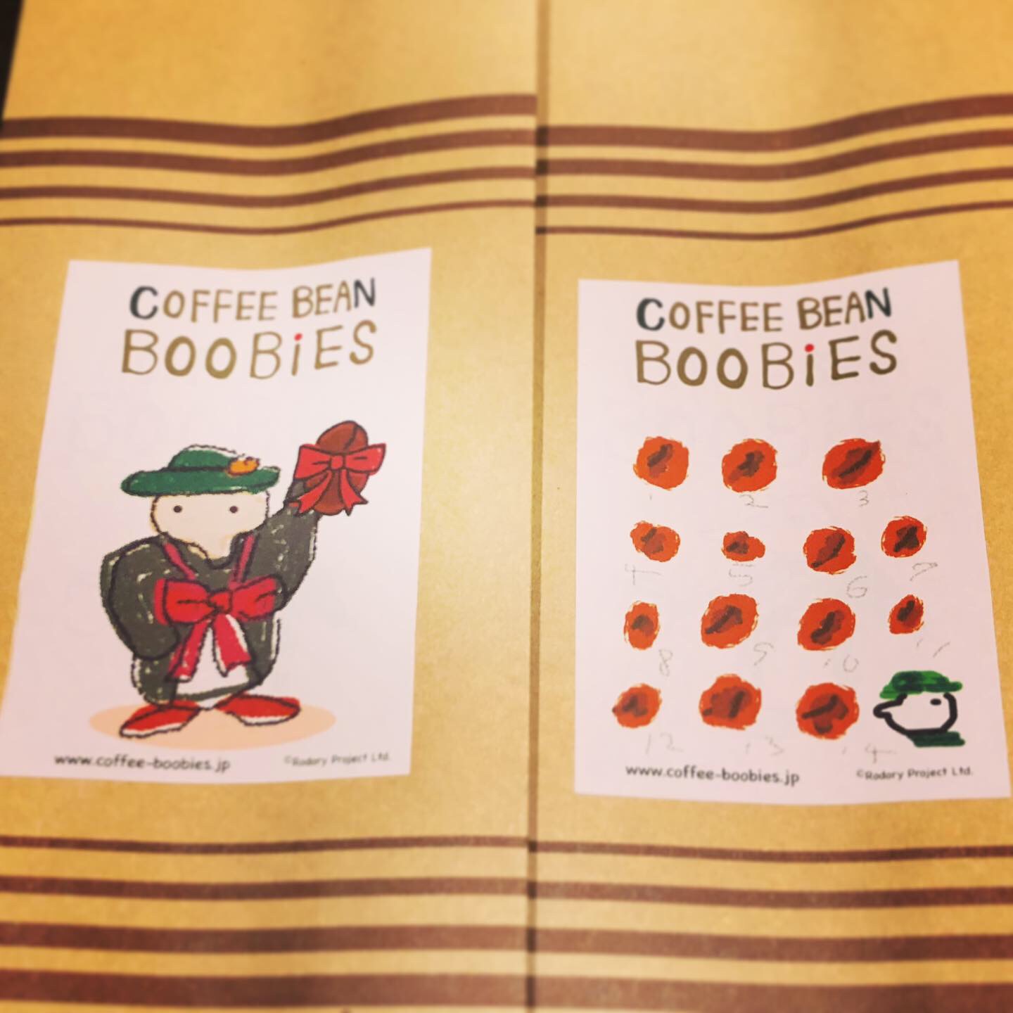 ブービーズではお買い上げいただいた珈琲豆を入れる袋にオリジナルのラベルを使用しています。通常はシンプルなラベル を使用していますが、時々期間限定で特別ラベルを作成、使用しています。