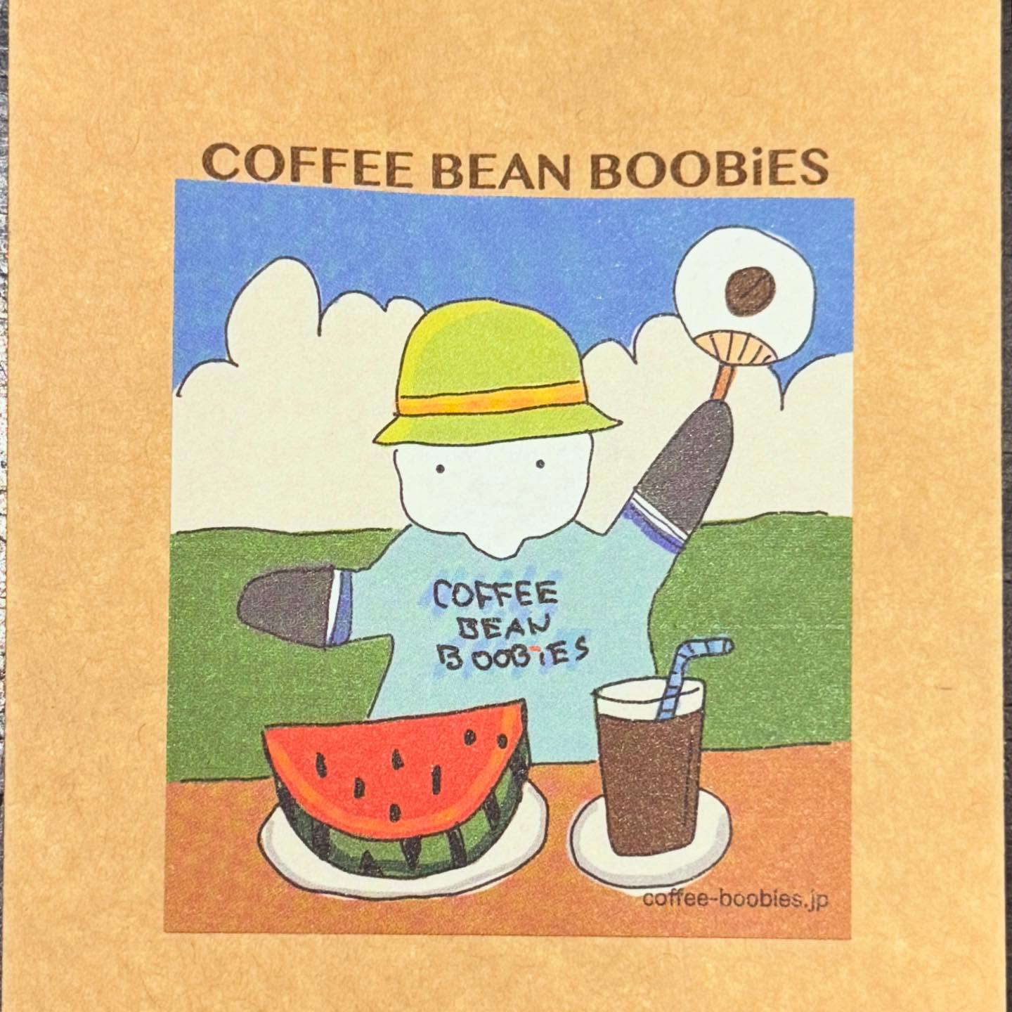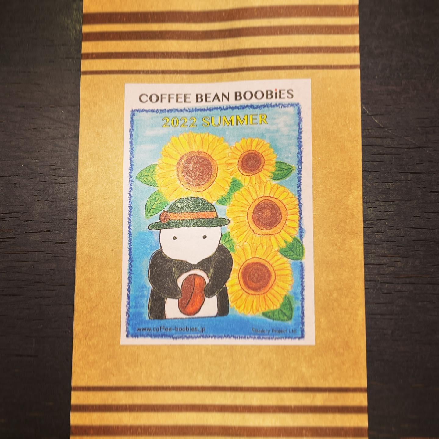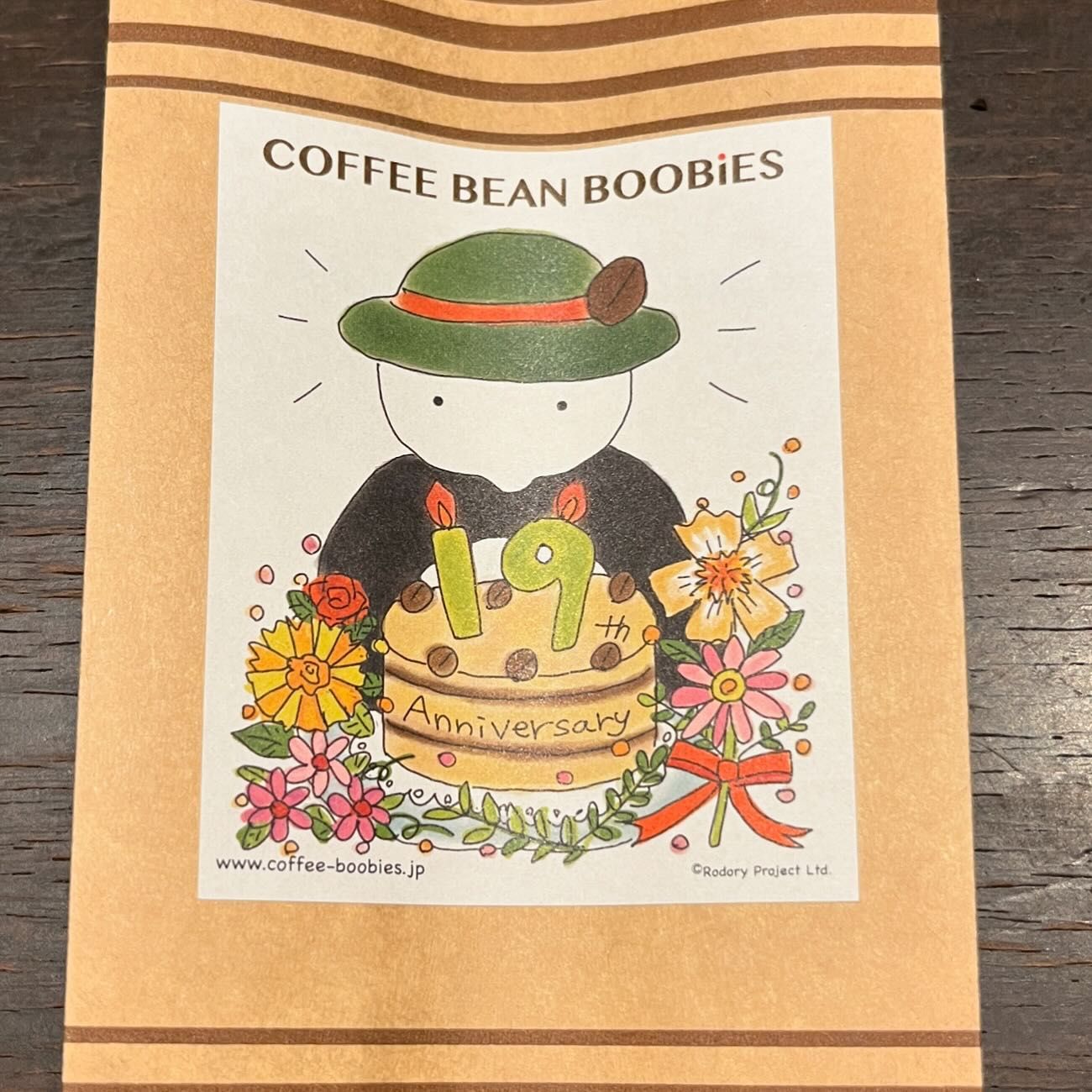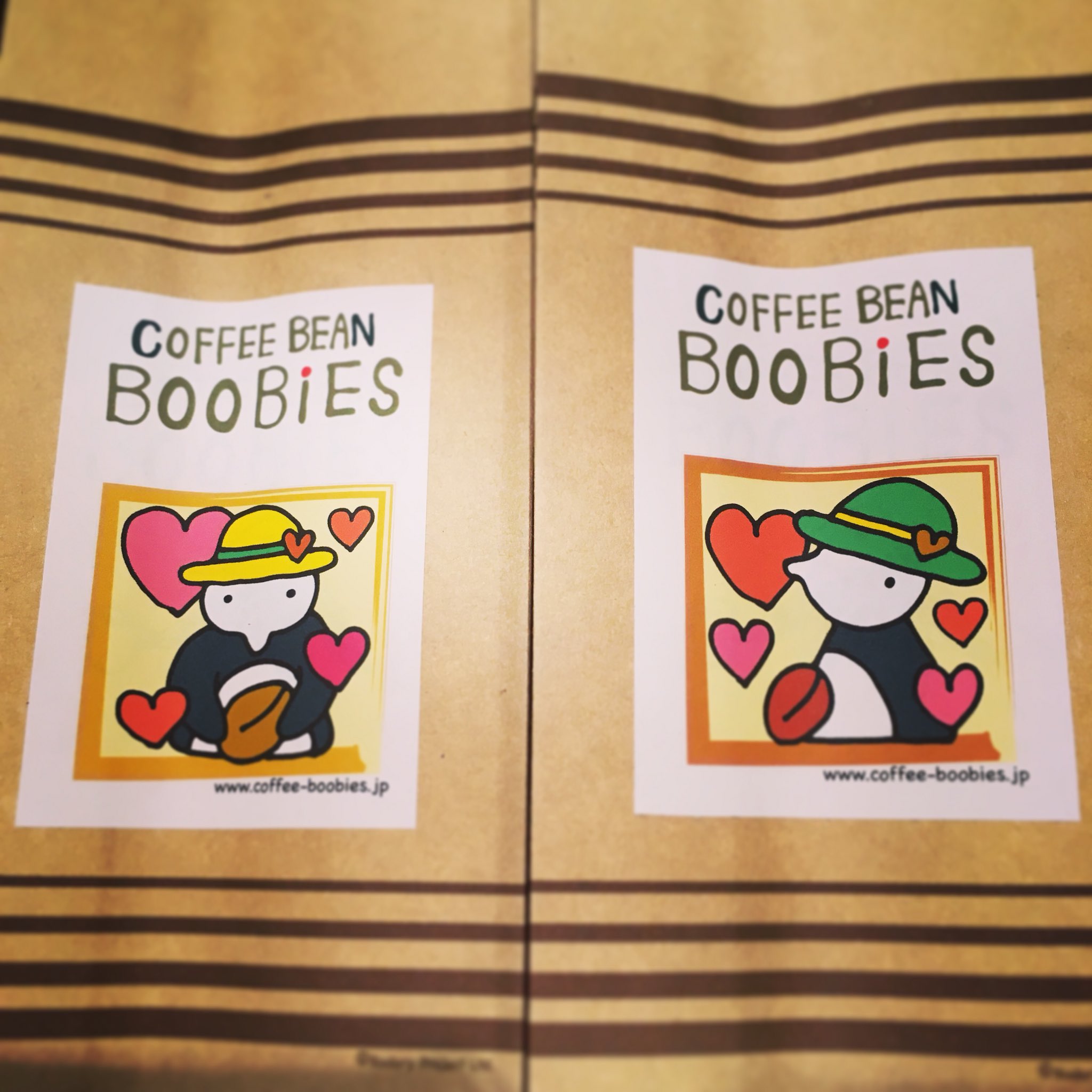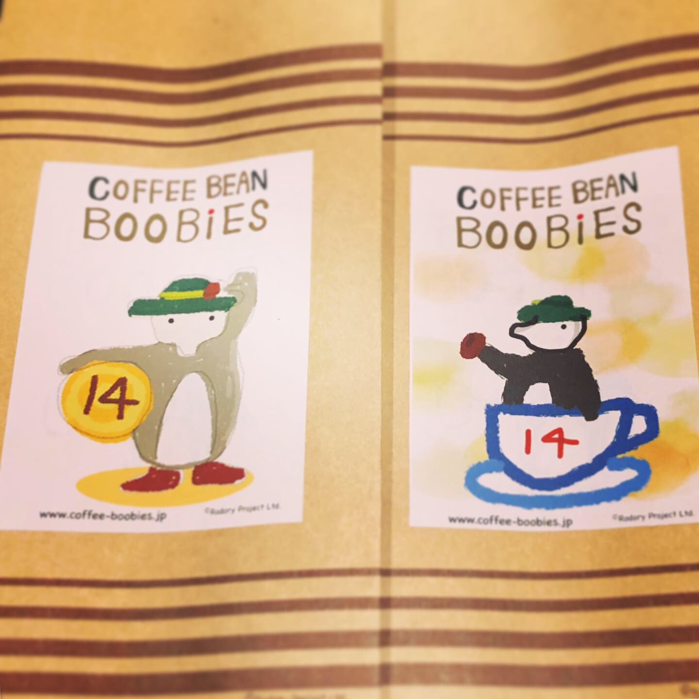 ブービーズではお買い上げいただいた珈琲豆を入れる袋にオリジナルのラベルを使用しています。通常はシンプルなラベル を使用していますが、時々期間限定で特別ラベルを作成、使用しています。