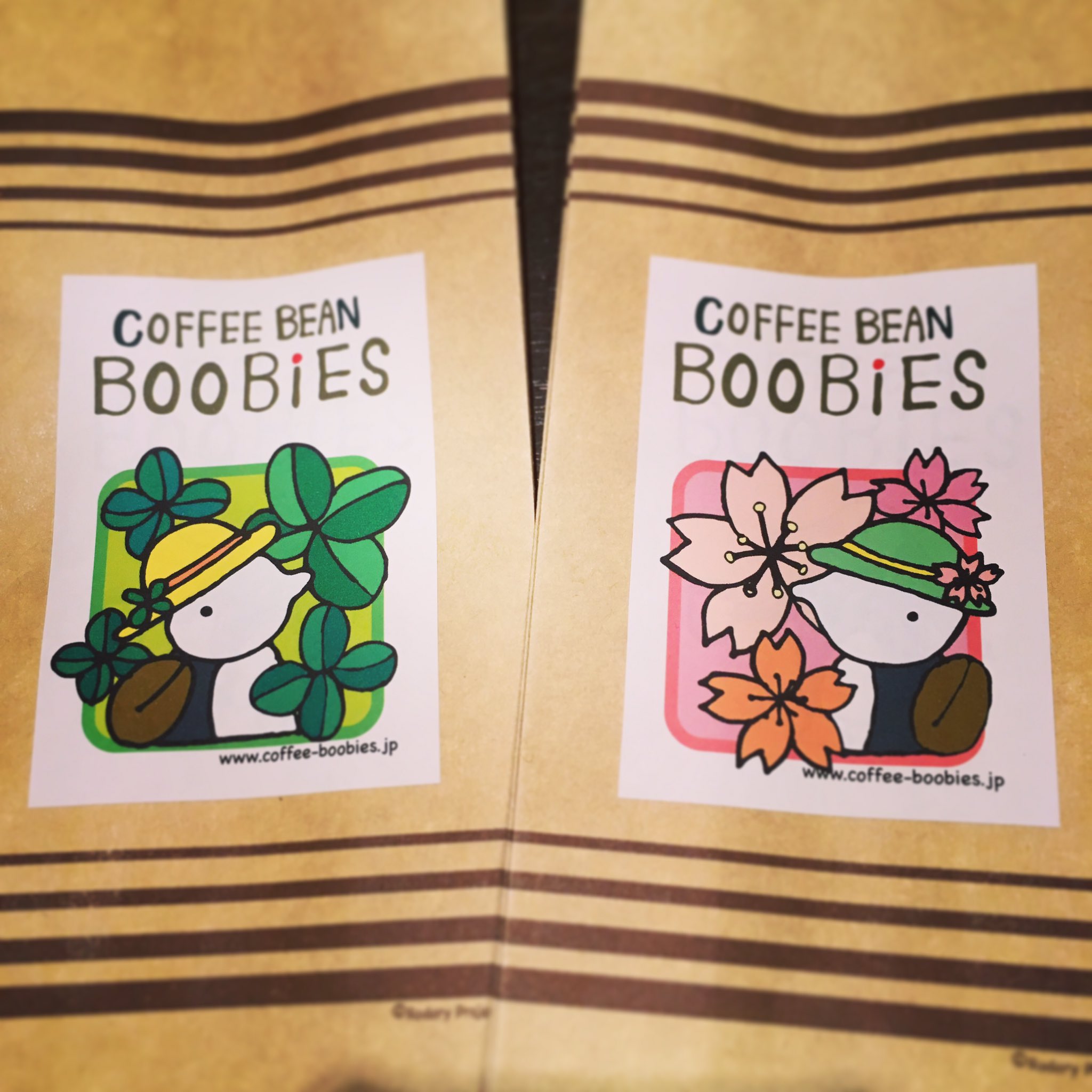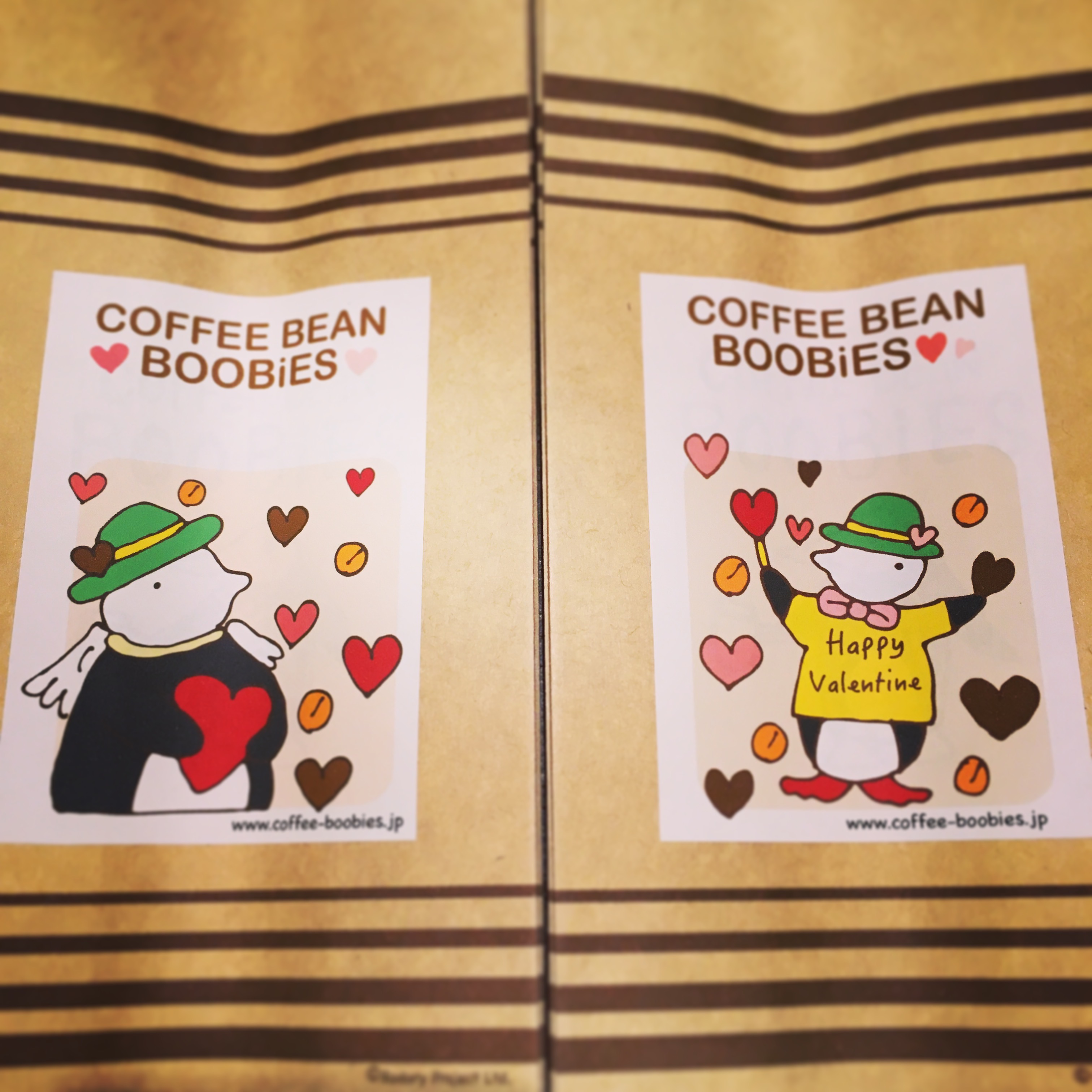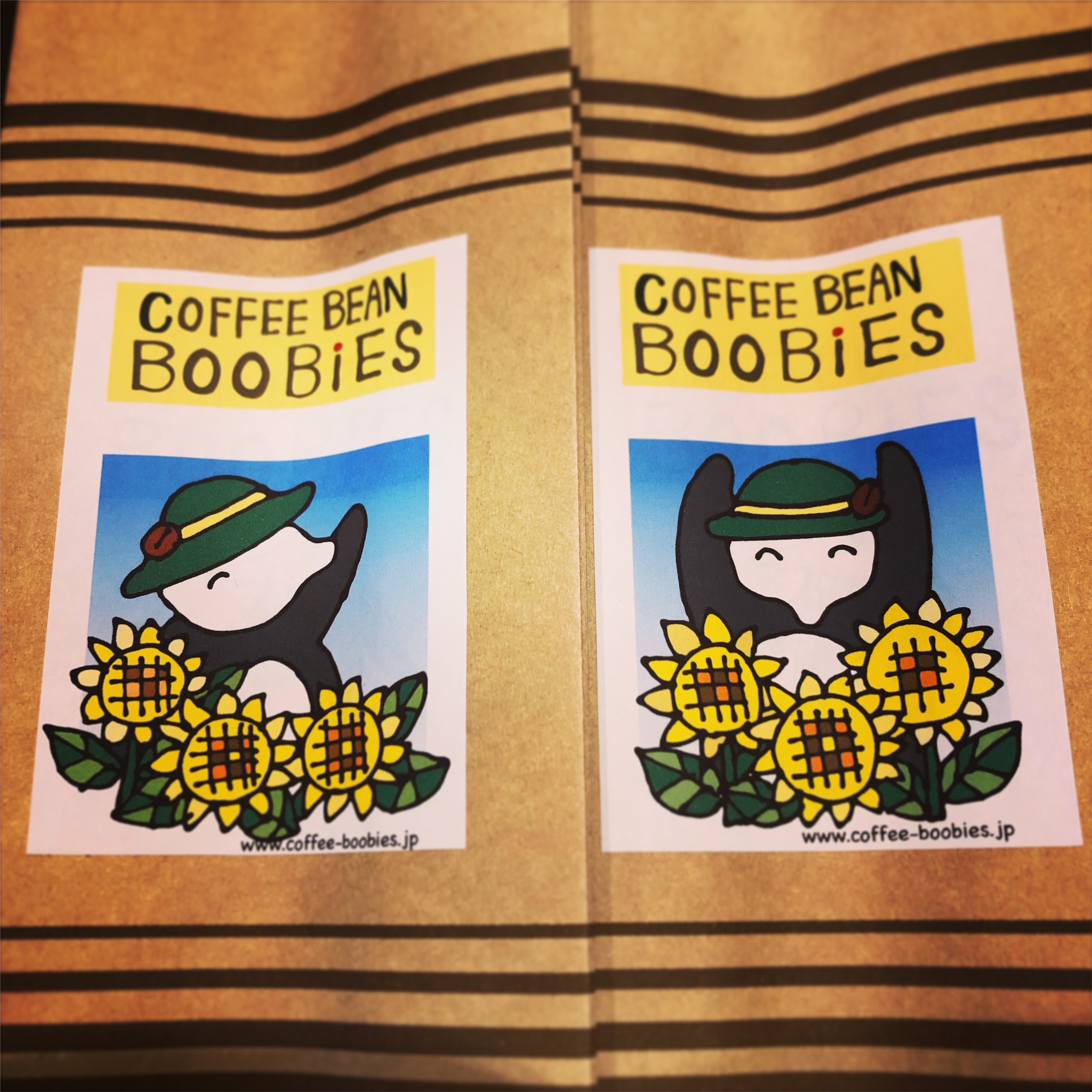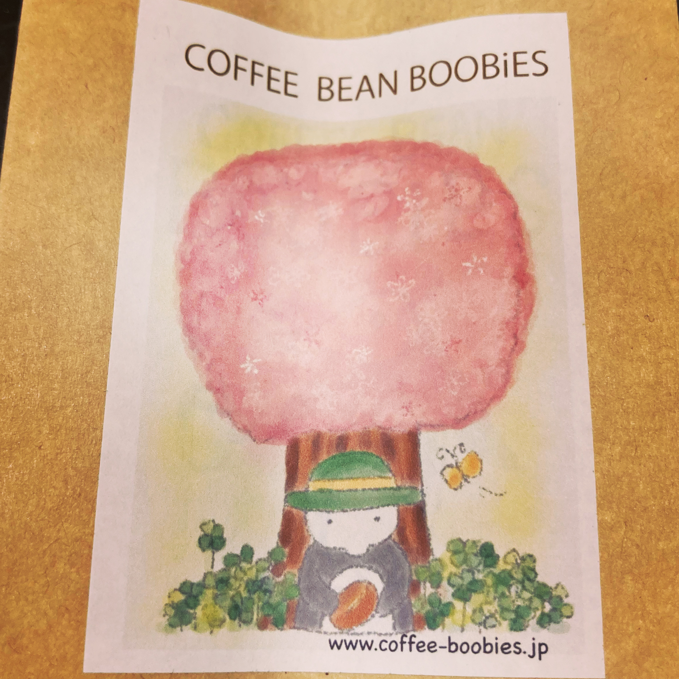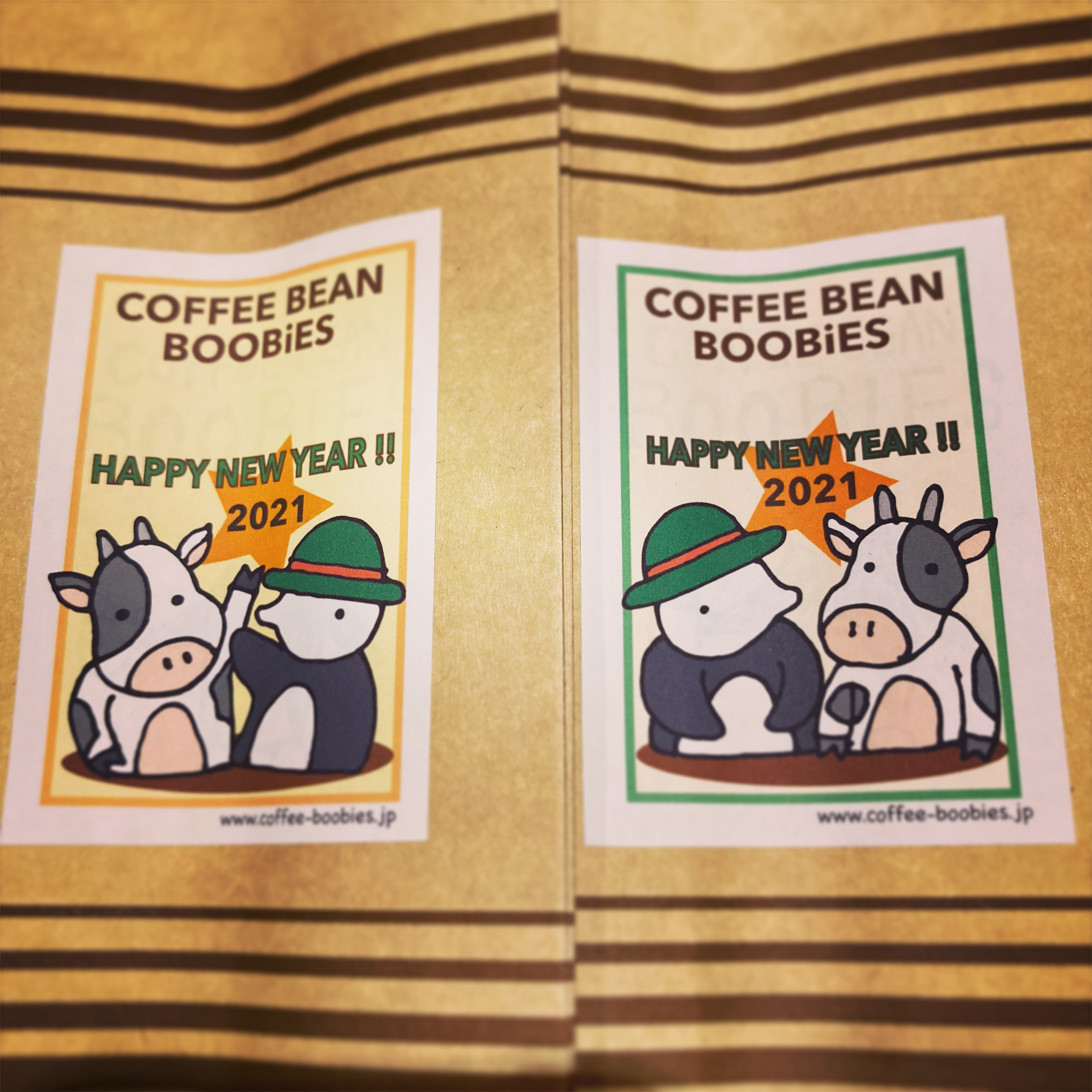ブービーズではお買い上げいただいた珈琲豆を入れる袋にオリジナルのラベルを使用しています。通常はシンプルなラベル を使用していますが、時々期間限定で特別ラベルを作成、使用しています。
