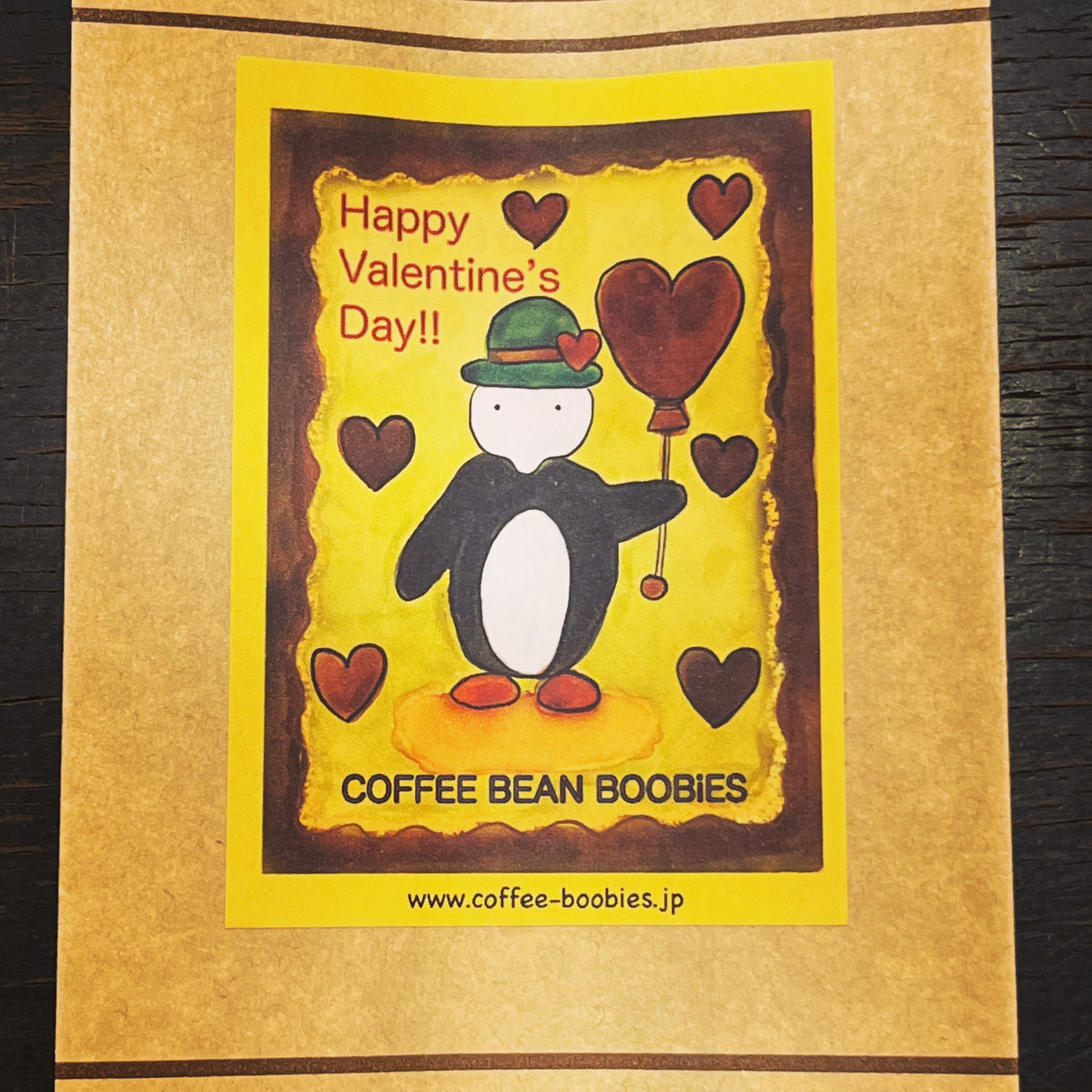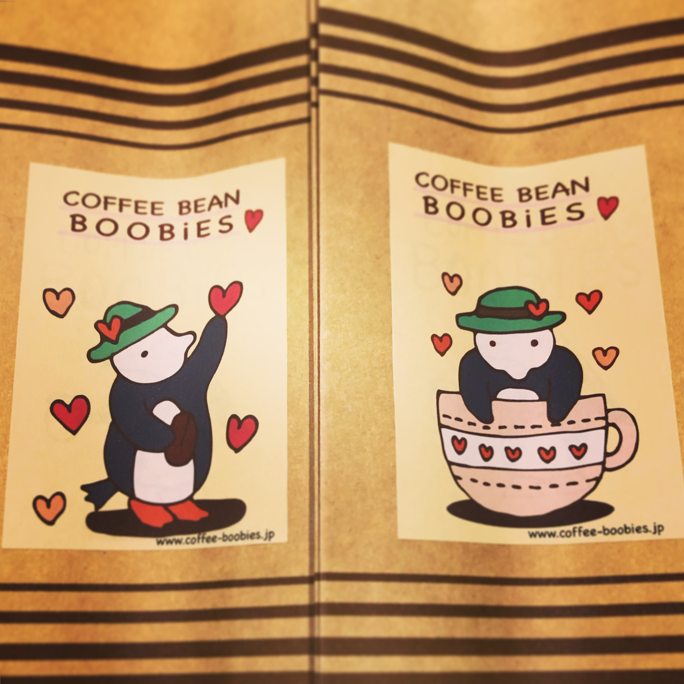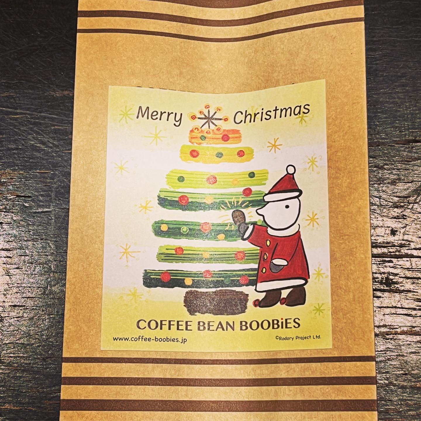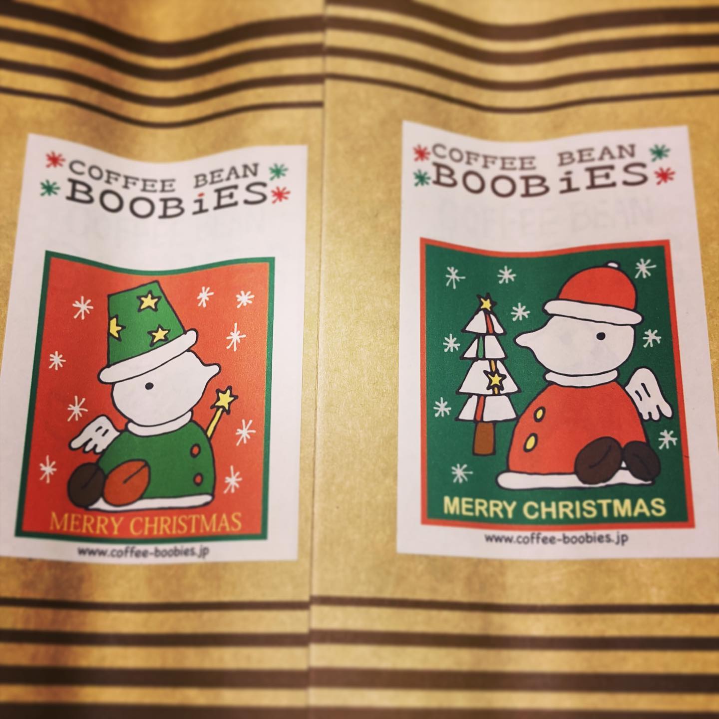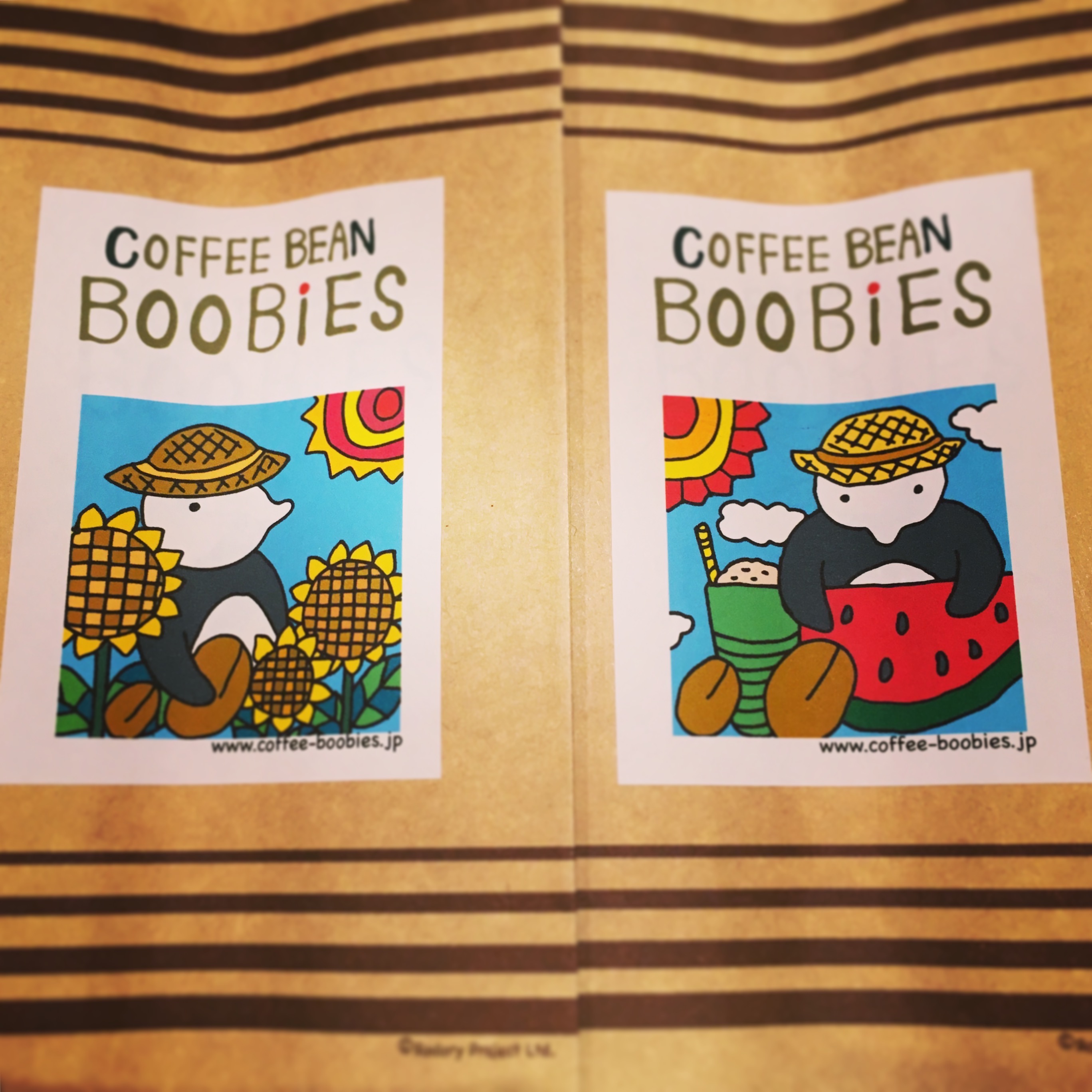 ブービーズではお買い上げいただいた珈琲豆を入れる袋にオリジナルのラベルを使用しています。通常はシンプルなラベル を使用していますが、時々期間限定で特別ラベルを作成、使用しています。