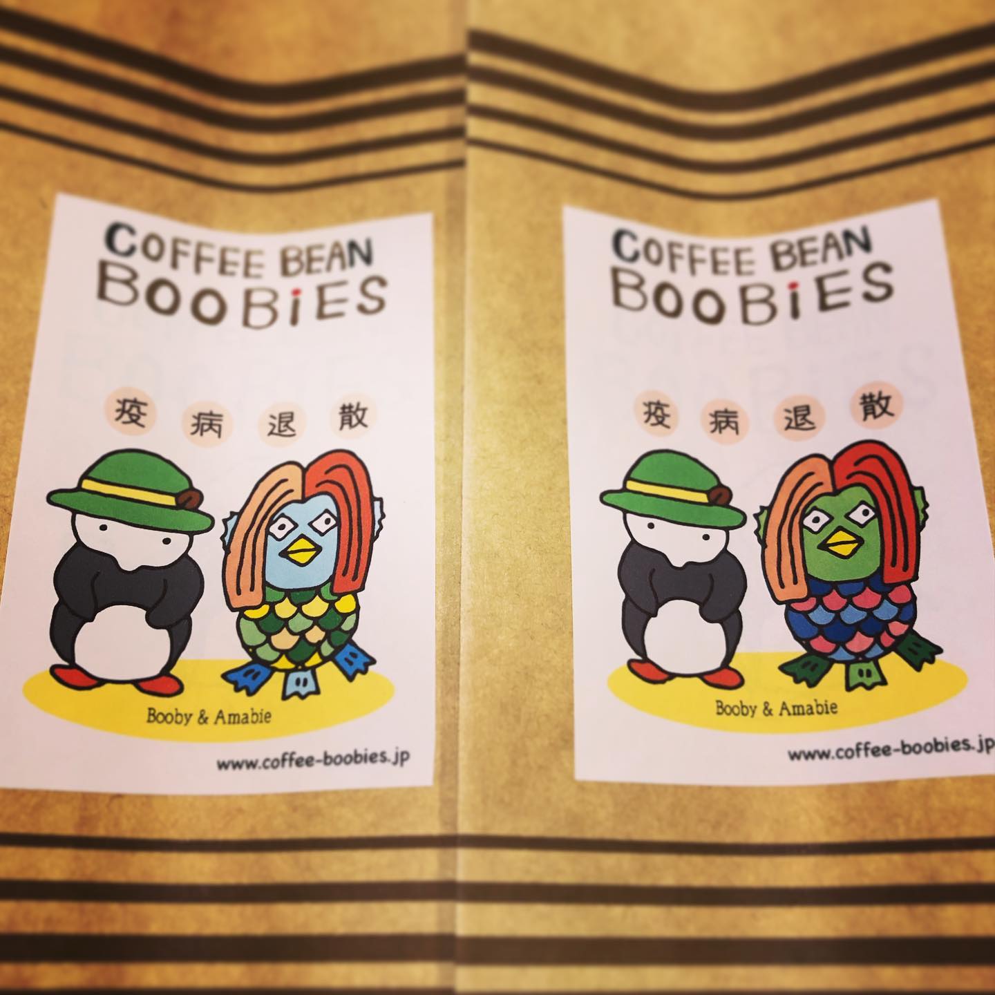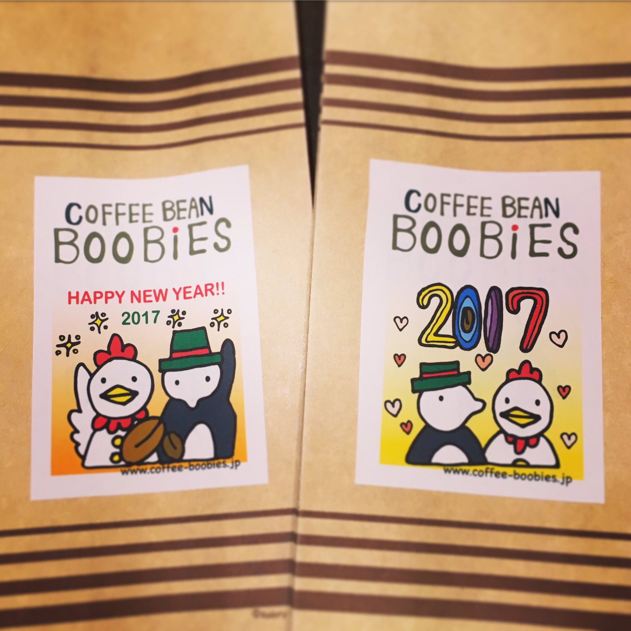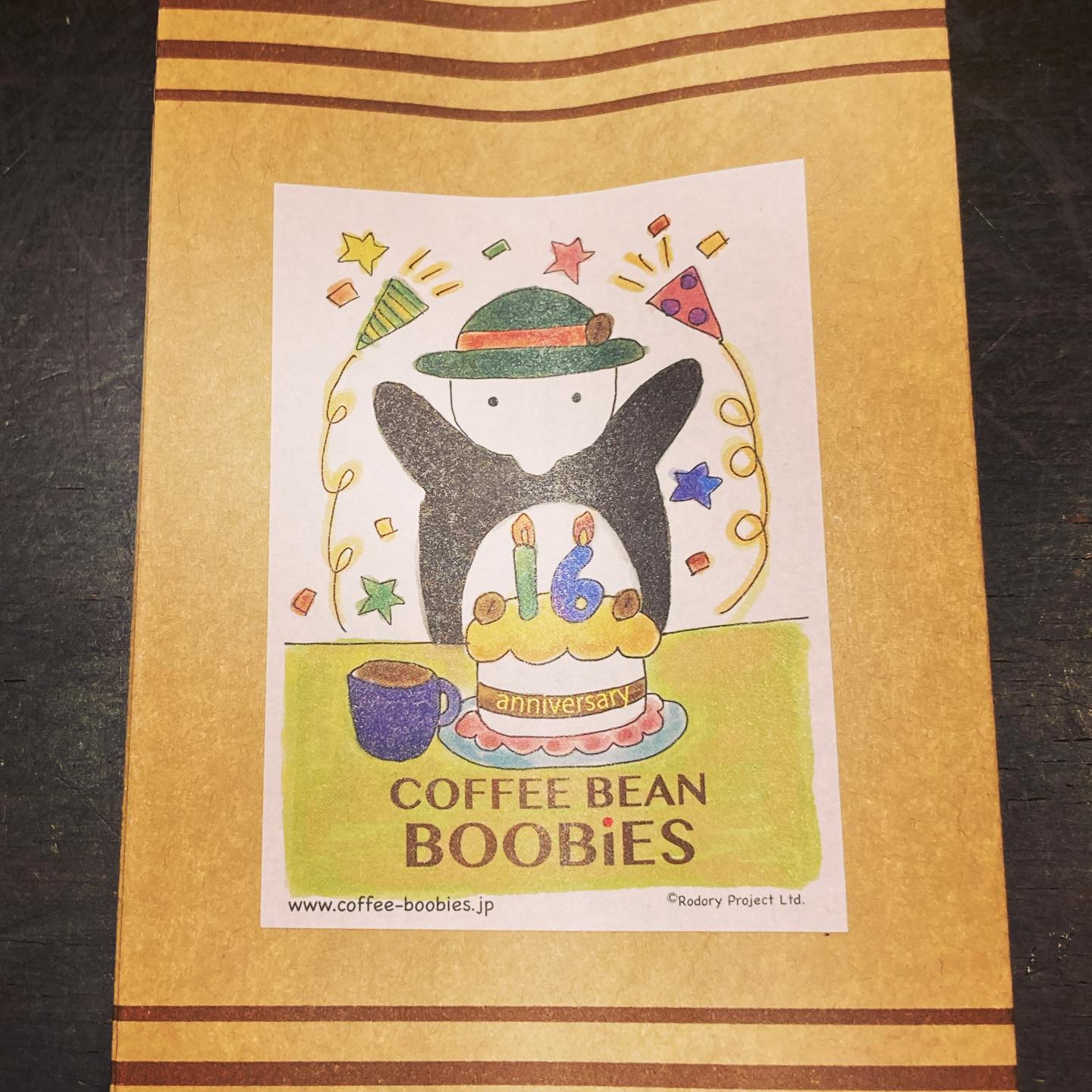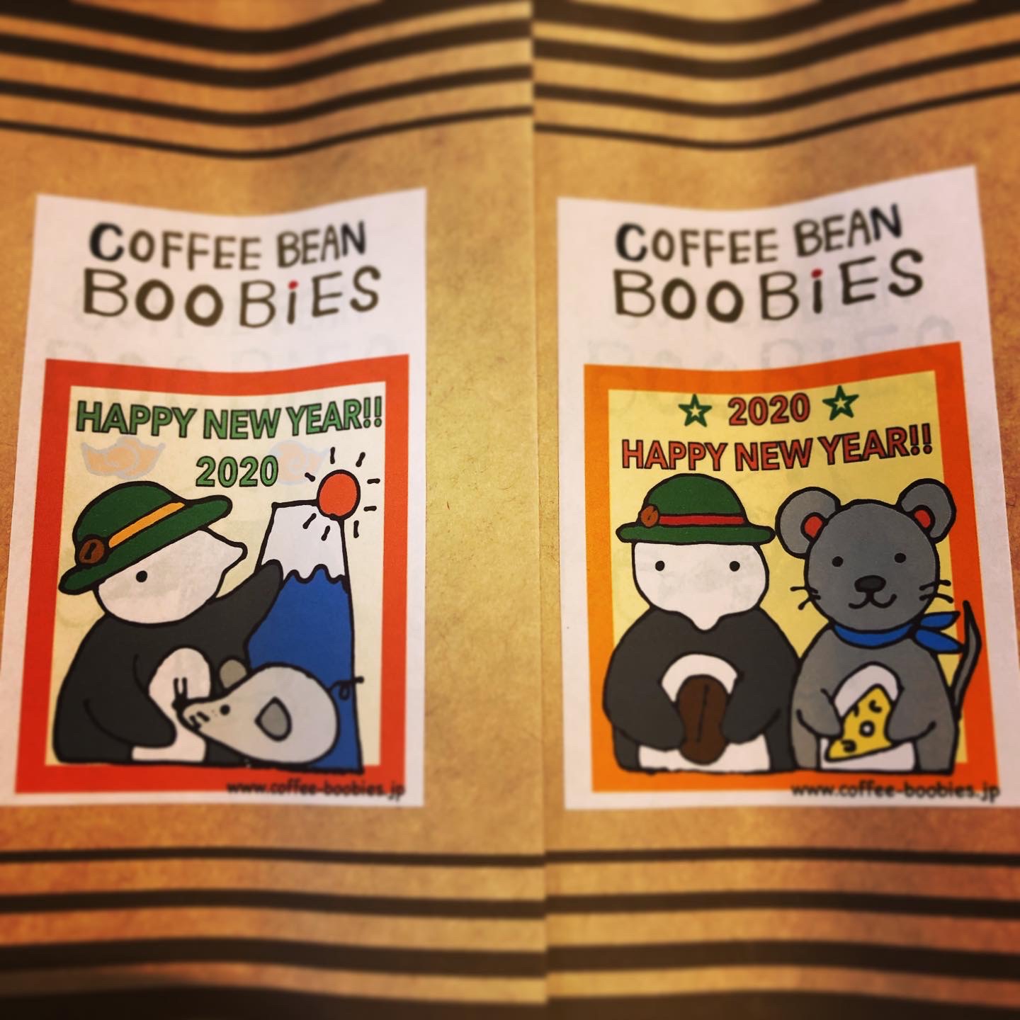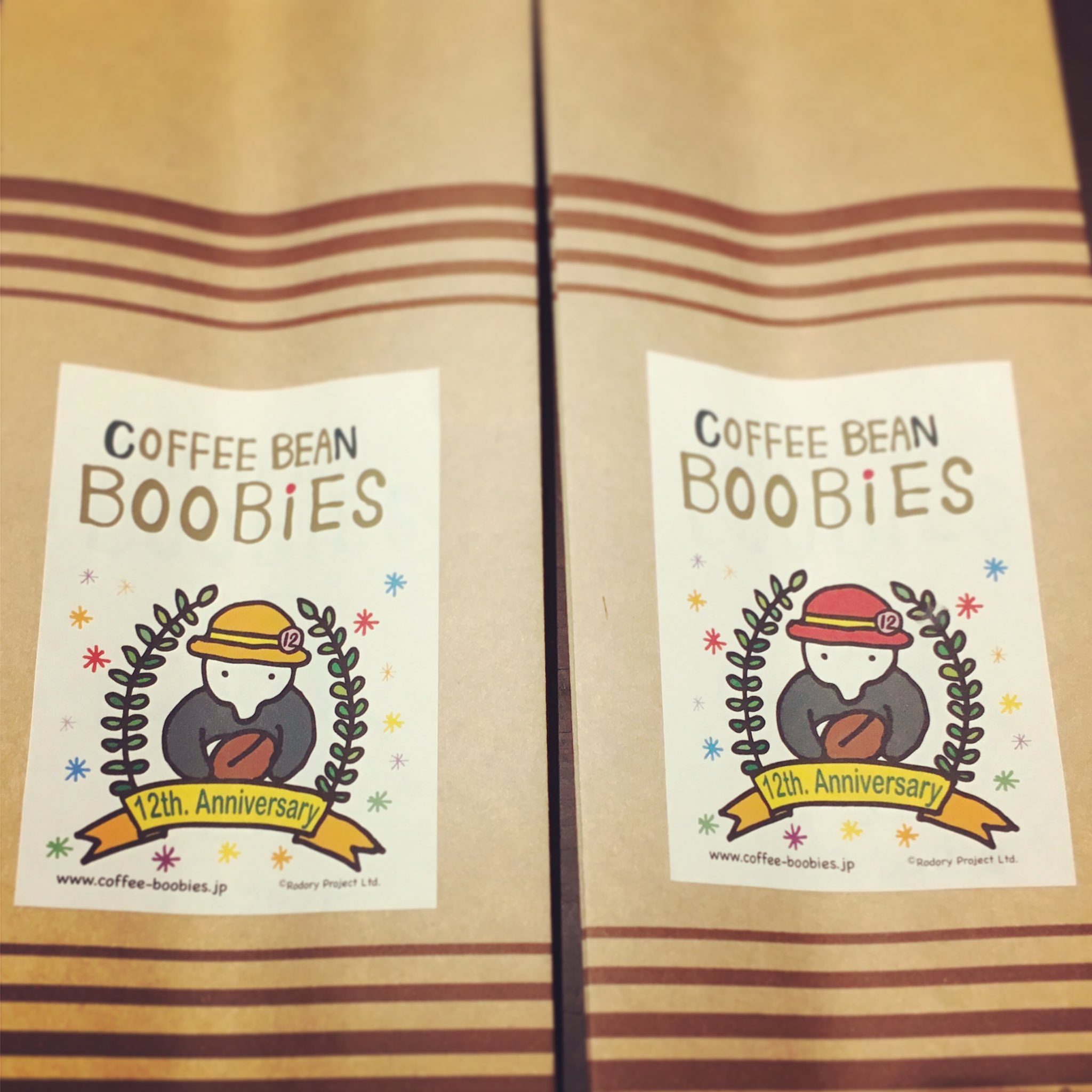 ブービーズではお買い上げいただいた珈琲豆を入れる袋にオリジナルのラベルを使用しています。通常はシンプルなラベル を使用していますが、時々期間限定で特別ラベルを作成、使用しています。