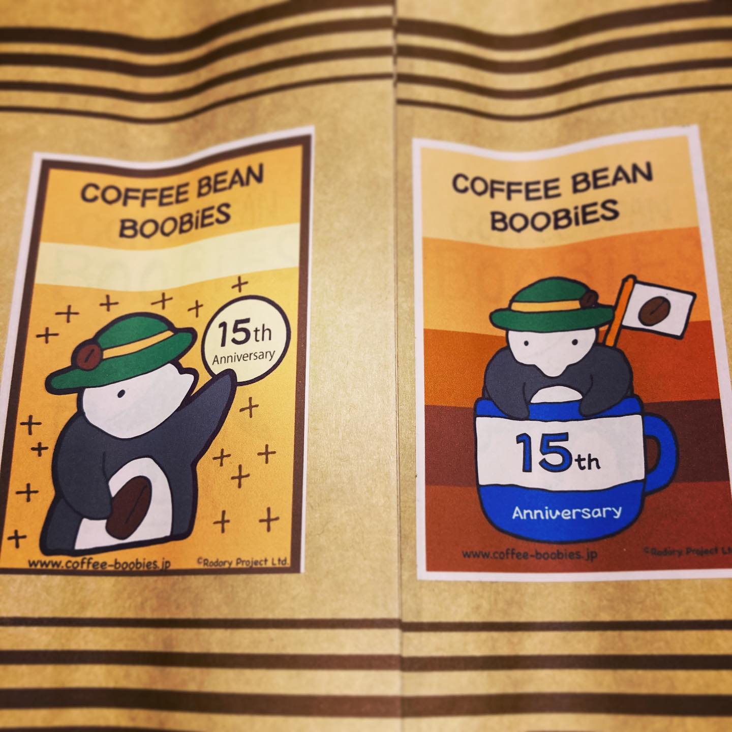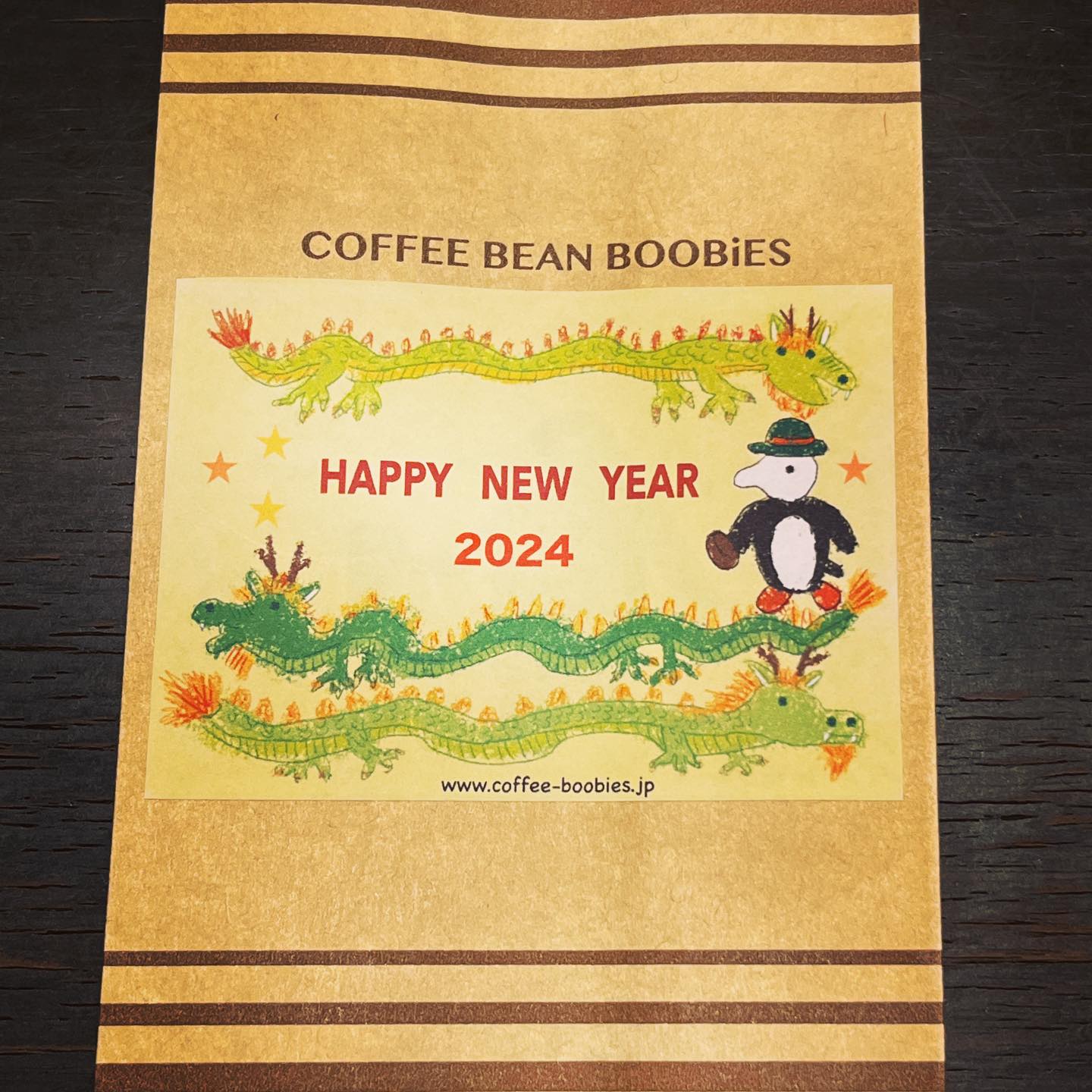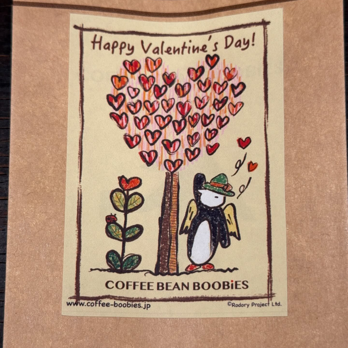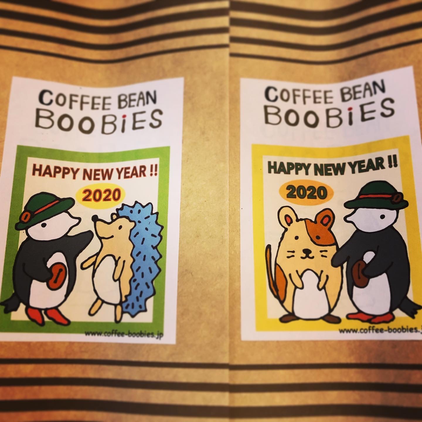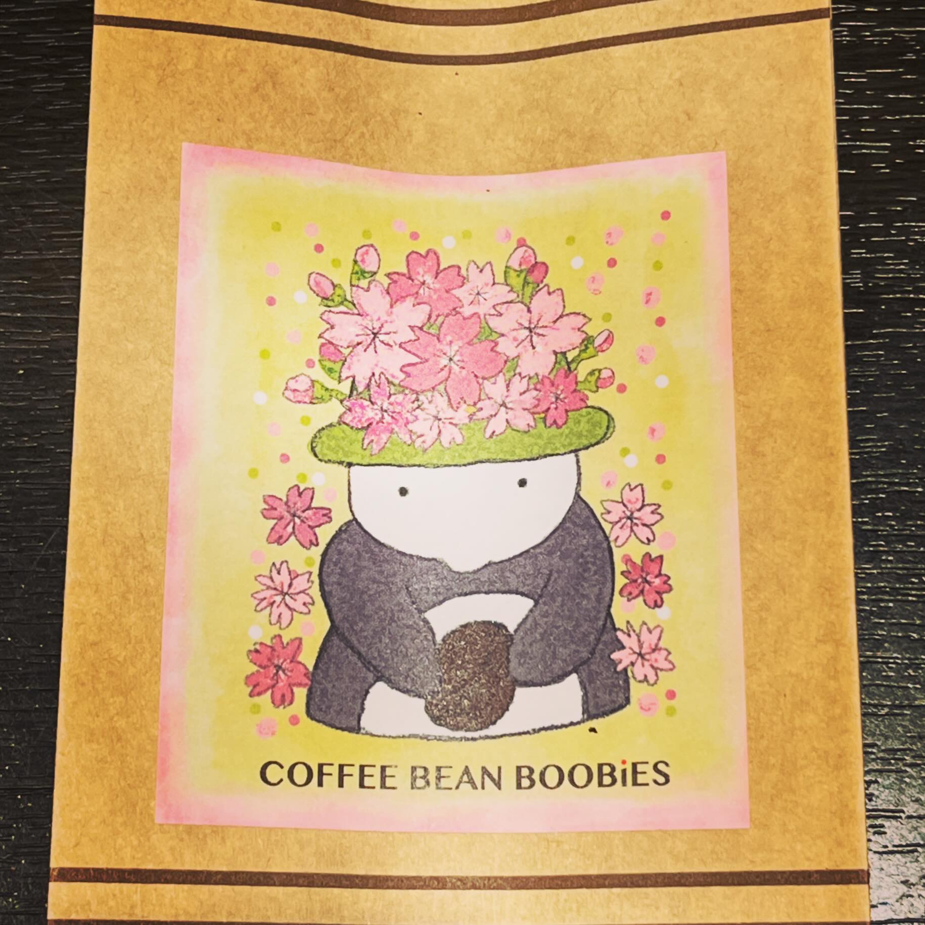ブービーズではお買い上げいただいた珈琲豆を入れる袋にオリジナルのラベルを使用しています。通常はシンプルなラベル を使用していますが、時々期間限定で特別ラベルを作成、使用しています。