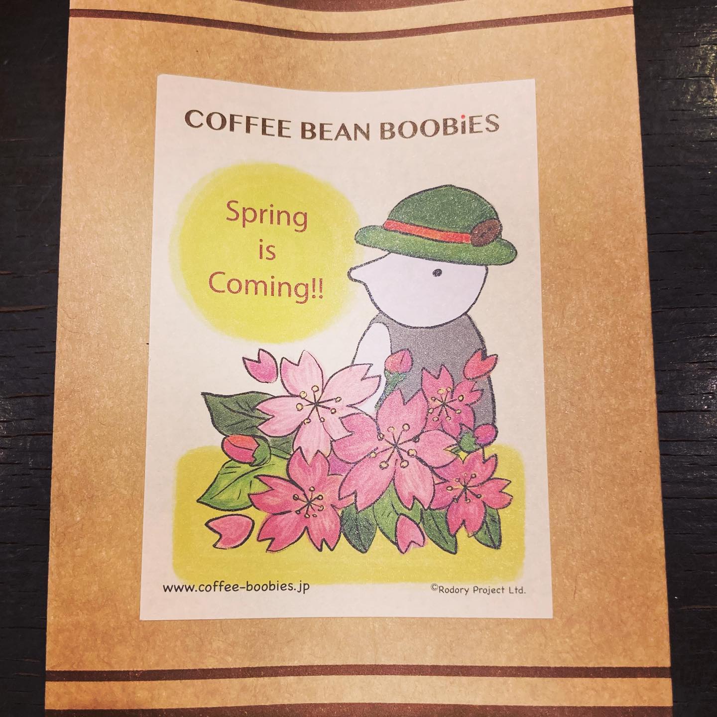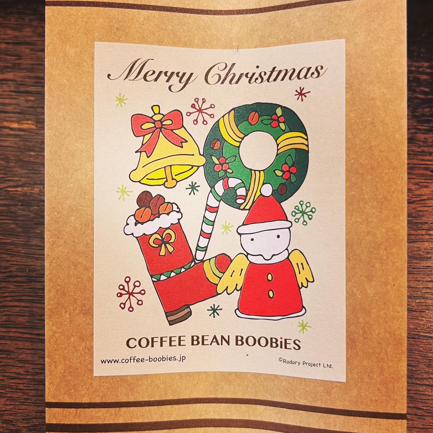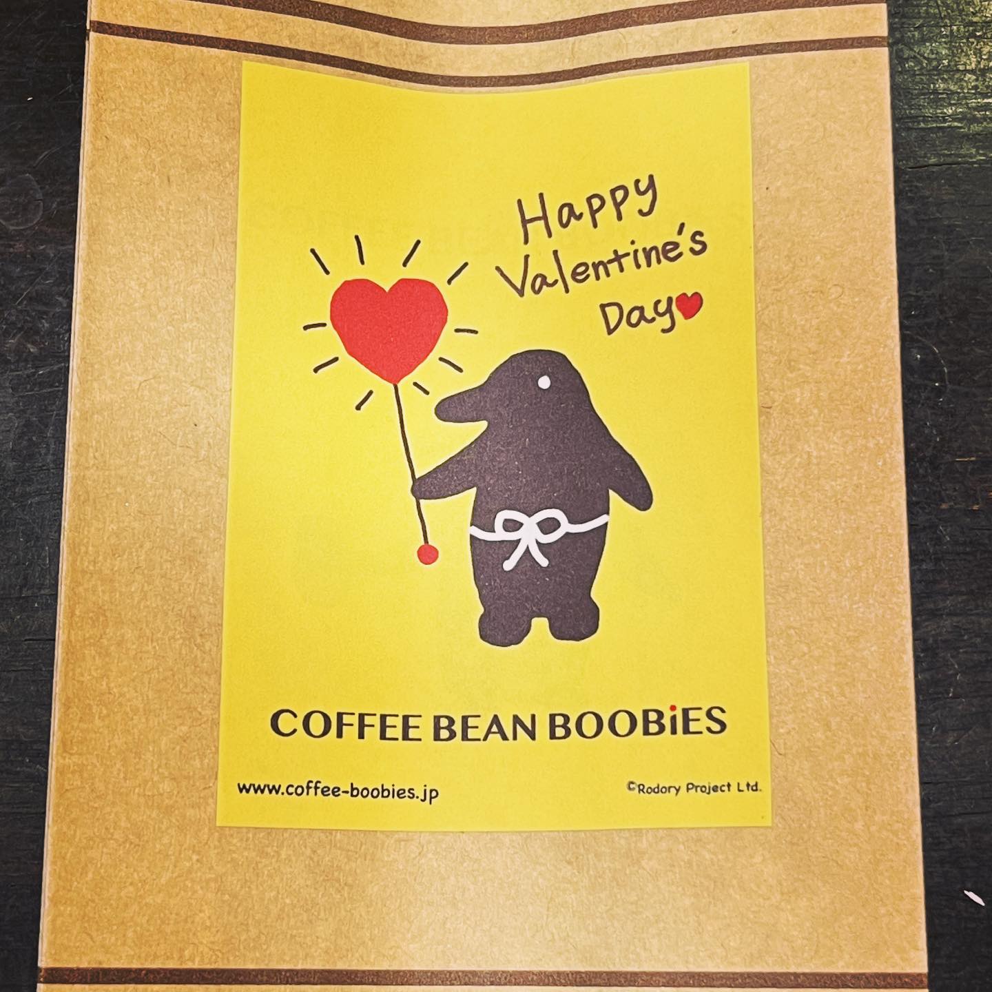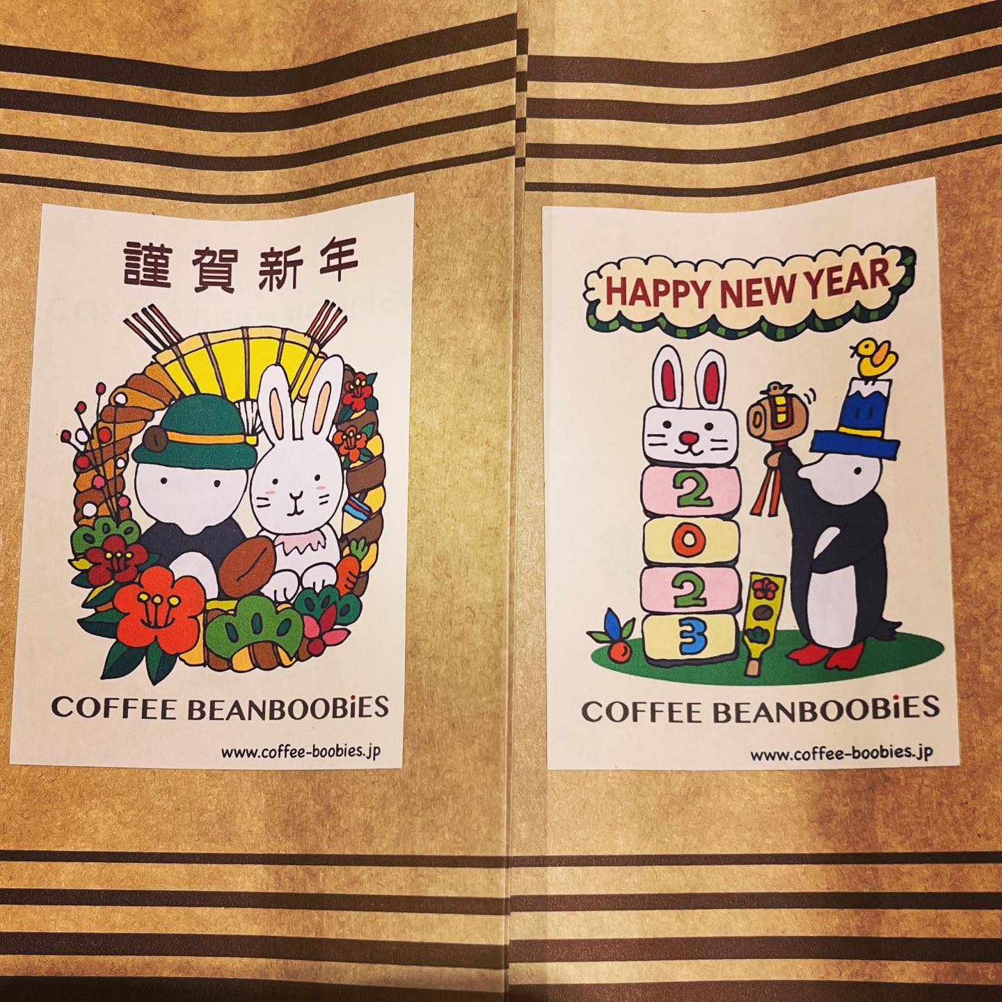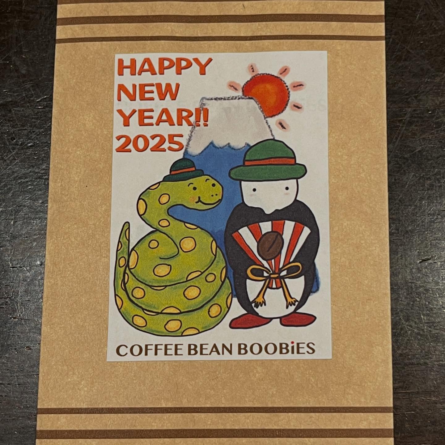 ブービーズではお買い上げいただいた珈琲豆を入れる袋にオリジナルのラベルを使用しています。通常はシンプルなラベル を使用していますが、時々期間限定で特別ラベルを作成、使用しています。
