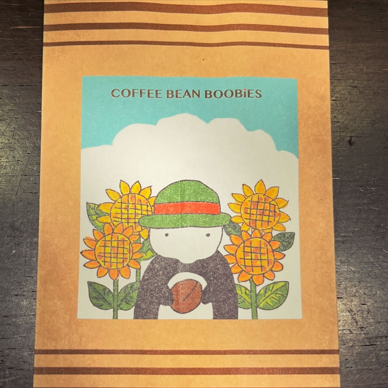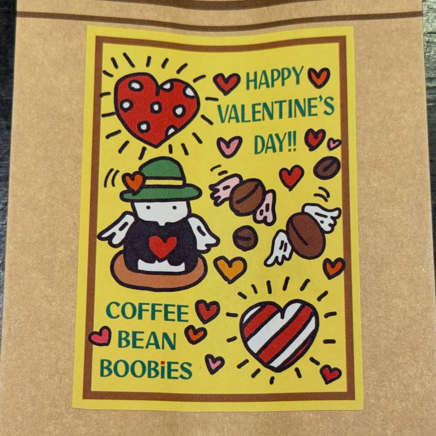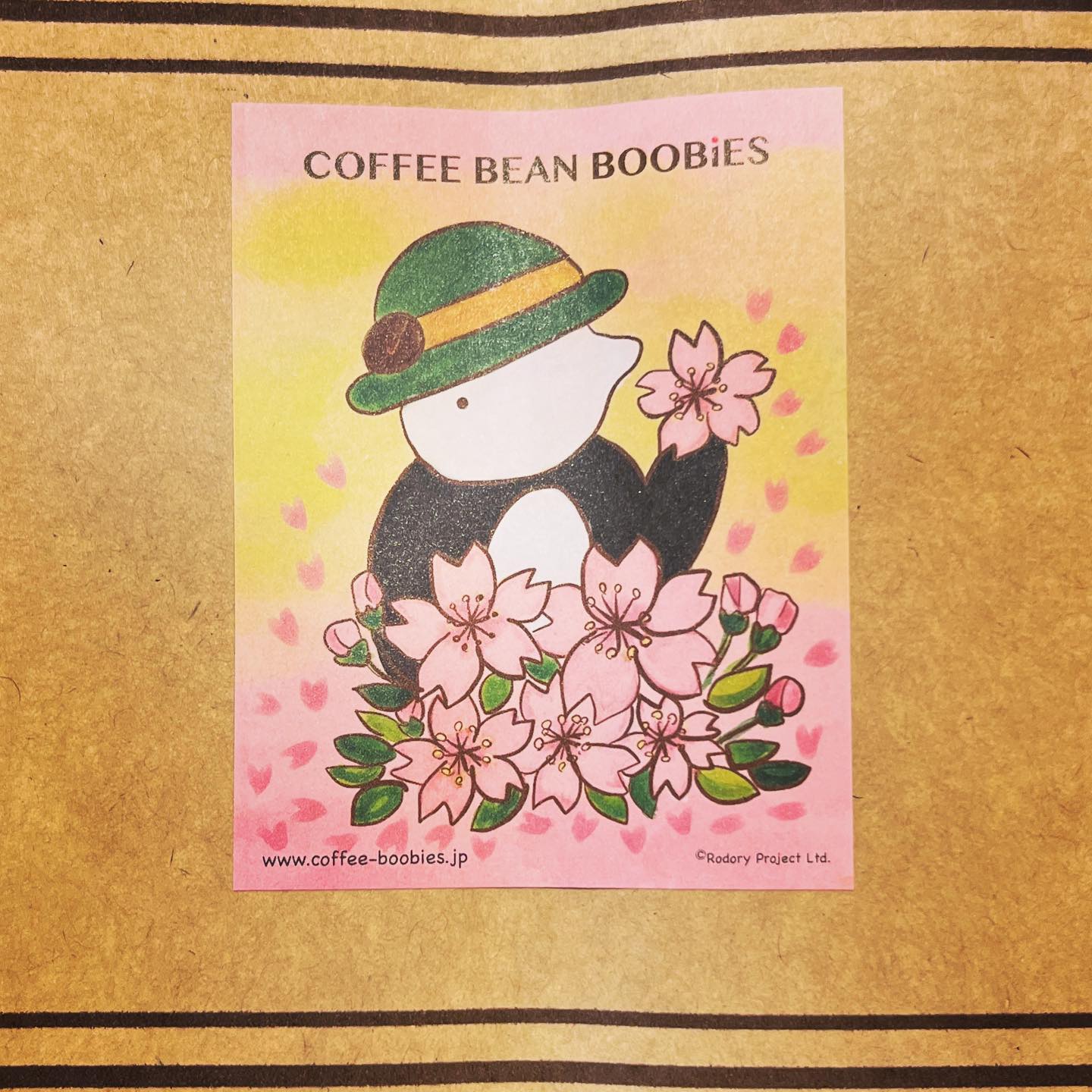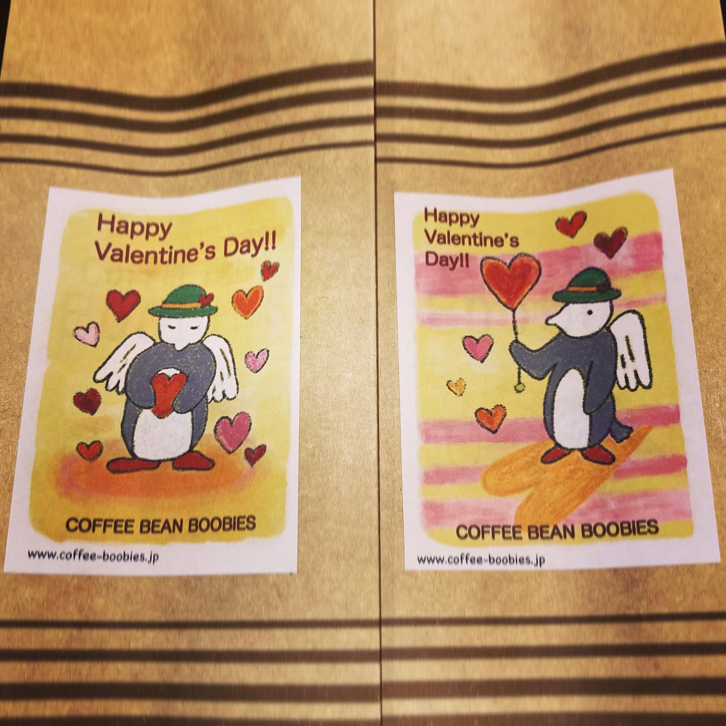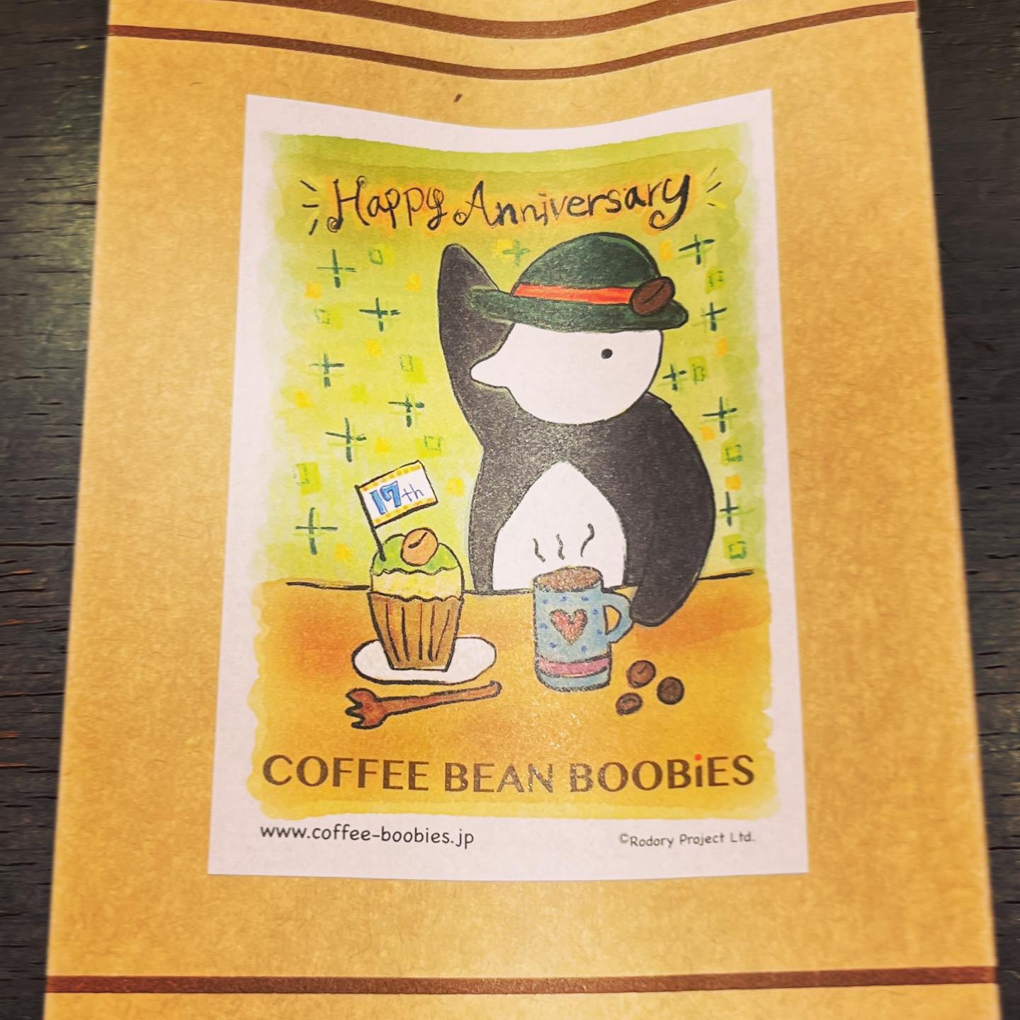 ブービーズではお買い上げいただいた珈琲豆を入れる袋にオリジナルのラベルを使用しています。通常はシンプルなラベル を使用していますが、時々期間限定で特別ラベルを作成、使用しています。